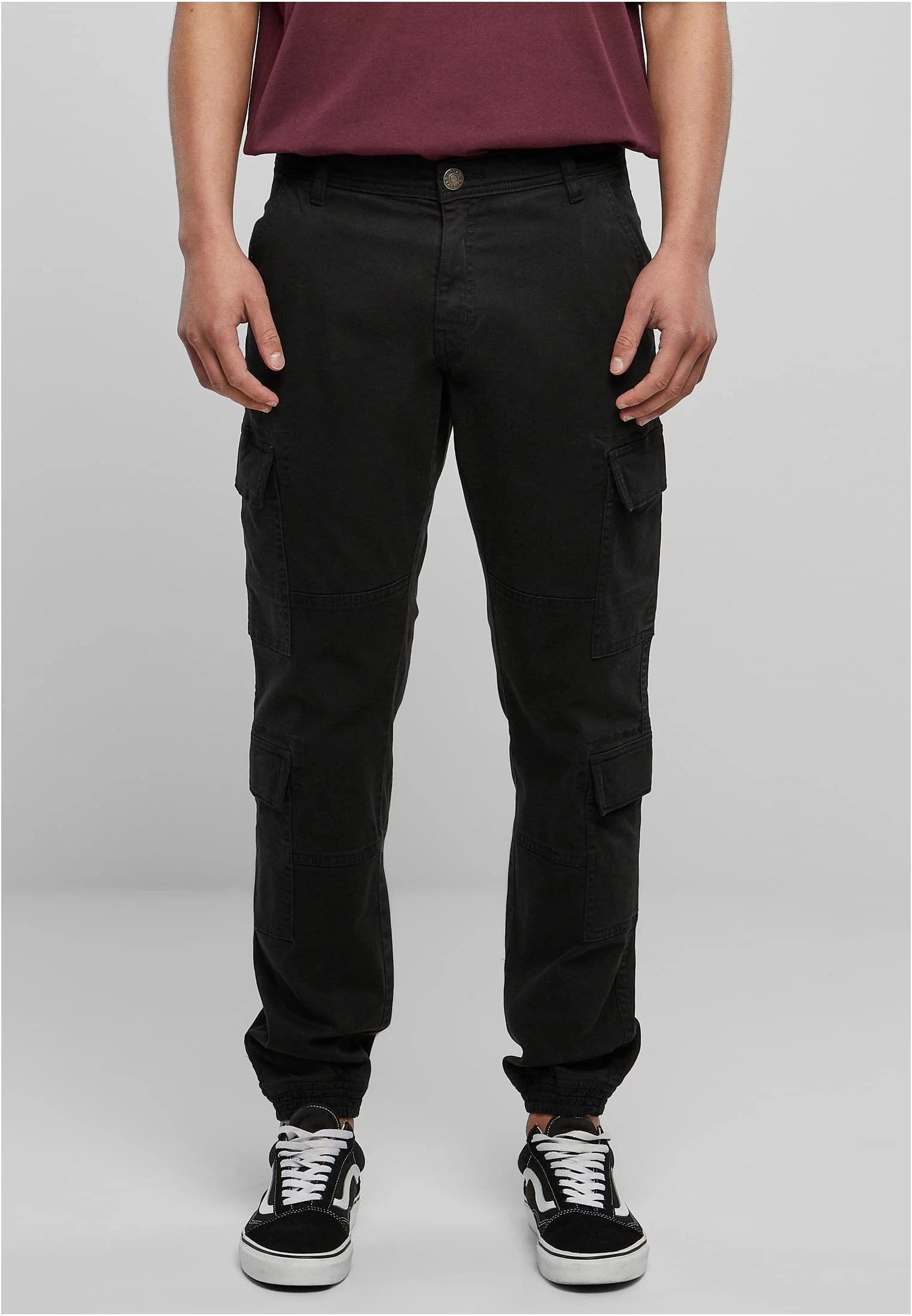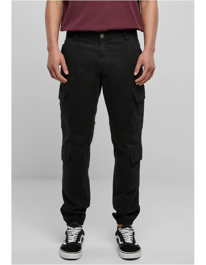 Sportovní pánský cargo jogger sedí vysoko na bocích. Dvě cargo kapsy jsou umístěny na každém stehně a jsou doplněny dělícími švy. Elastické manžety, boční kapsy a integrované zadní kapsy doplňují styl. Pánské cargo joggery jsou vyrobeny z pružného strečového kepru. Střih je pravidelný.