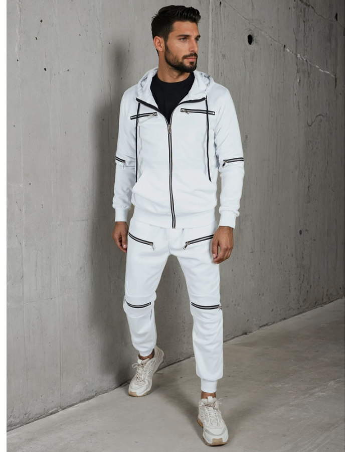 Męski dres z kapturem i spodniami wykończonymi ściągaczami, ozdobiony metalowymi suwakami na klatce piersiowej, rękawach i nogawkach. Wyróżnia się sportowym stylem z nutą streetwearu. Elastyczny materiał zapewnia komfort noszenia. Sprawdza się wiosną na co dzień i w drodze na trening.