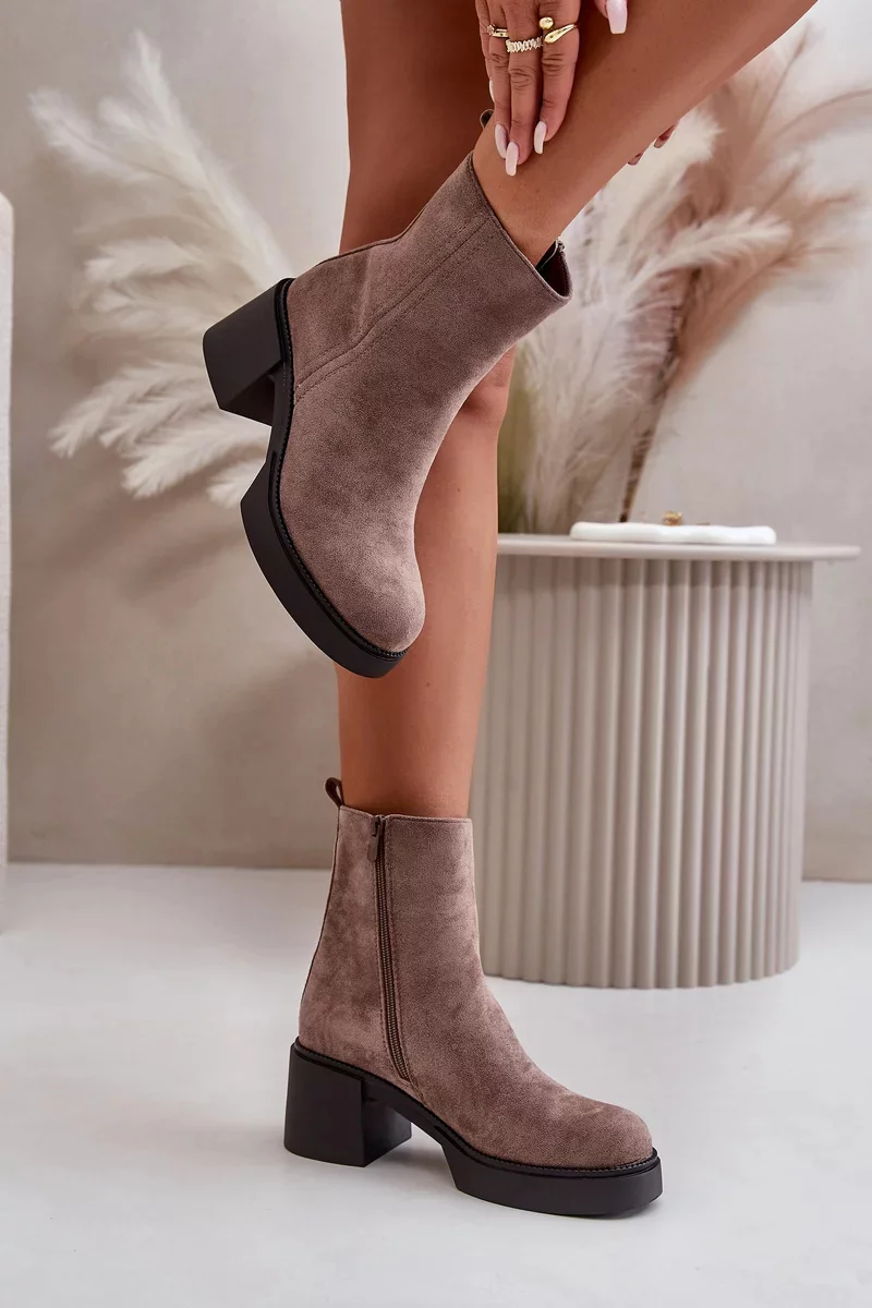 Dámské kotníkové boty na stabilním podpatku a platformě, vyrobené z eko semiše, jsou stylovou volbou na chladnější dny.