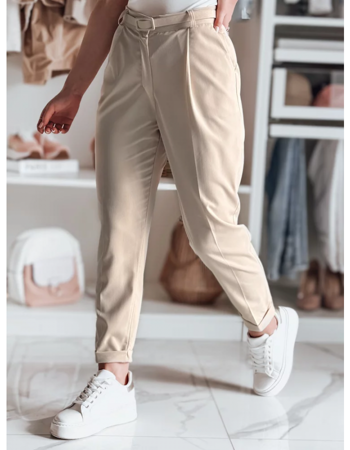 Klasyczne spodnie damskie w casualowym wydaniu. Wysoki stan i plisowania optycznie wysmuklają sylwetkę, a pasek w komplecie dopełnia całość. Zapinane na guzik i zamek, z kieszeniami dla większej wygody. Sprawdzą się zarówno w pracy, jak i podczas spotkań towarzyskich.