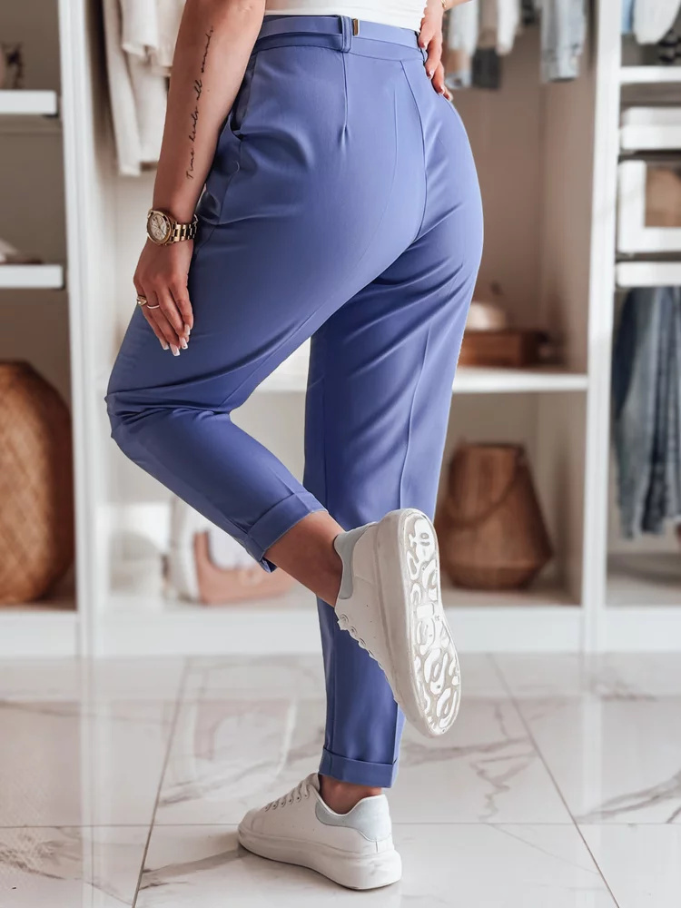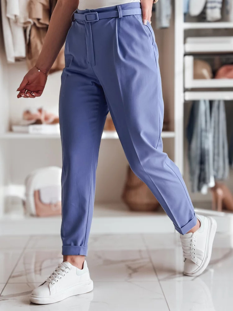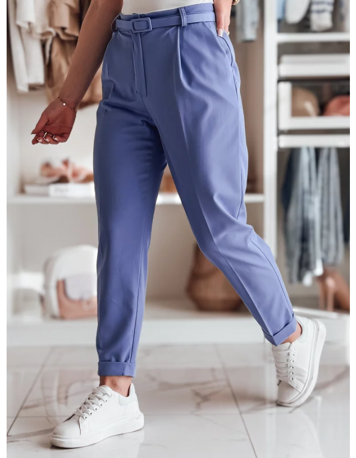 Klasyczne spodnie damskie w casualowym wydaniu. Wysoki stan i plisowania optycznie wysmuklają sylwetkę, a pasek w komplecie dopełnia całość. Zapinane na guzik i zamek, z kieszeniami dla większej wygody. Sprawdzą się zarówno w pracy, jak i podczas spotkań towarzyskich.