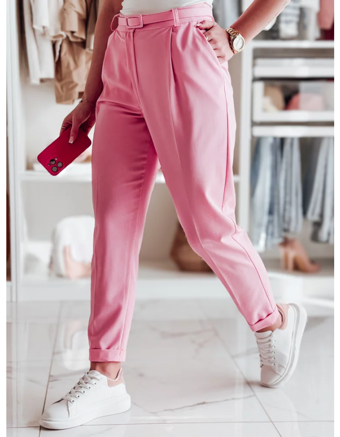Klasyczne spodnie damskie w casualowym wydaniu. Wysoki stan i plisowania optycznie wysmuklają sylwetkę, a pasek w komplecie dopełnia całość. Zapinane na guzik i zamek, z kieszeniami dla większej wygody. Sprawdzą się zarówno w pracy, jak i podczas spotkań towarzyskich.