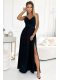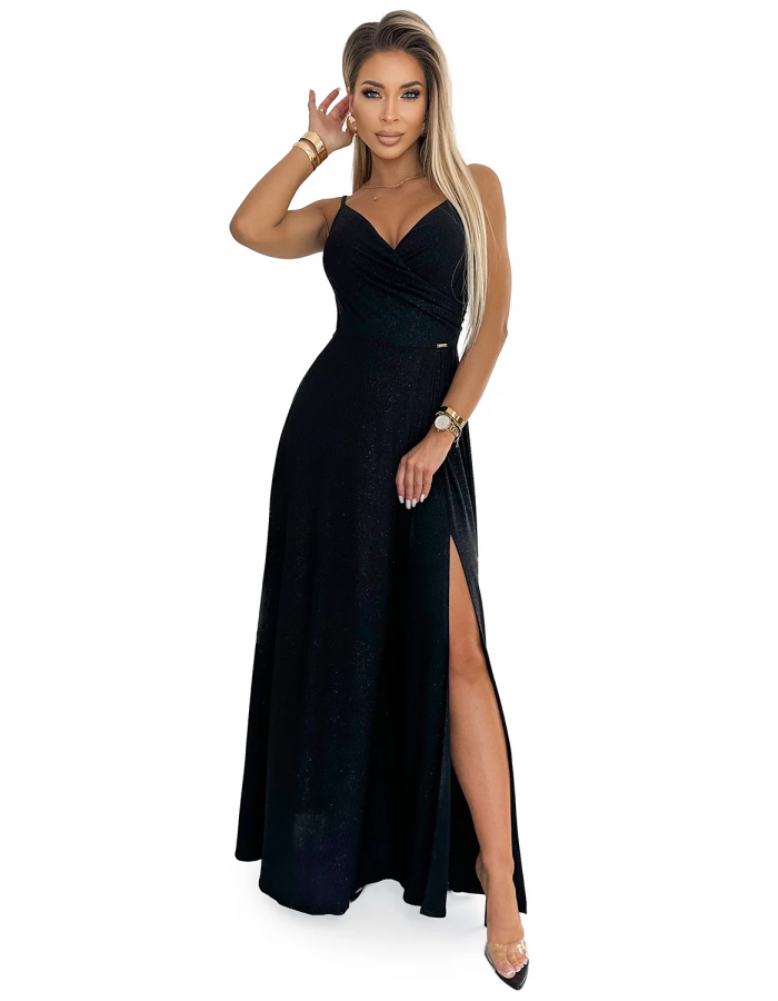 Chiara jsou elegantní, dlouhé maxi šaty na ramínkách, vyrobené z lesklého, třpytivého materiálu v klasické černé barvě.