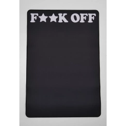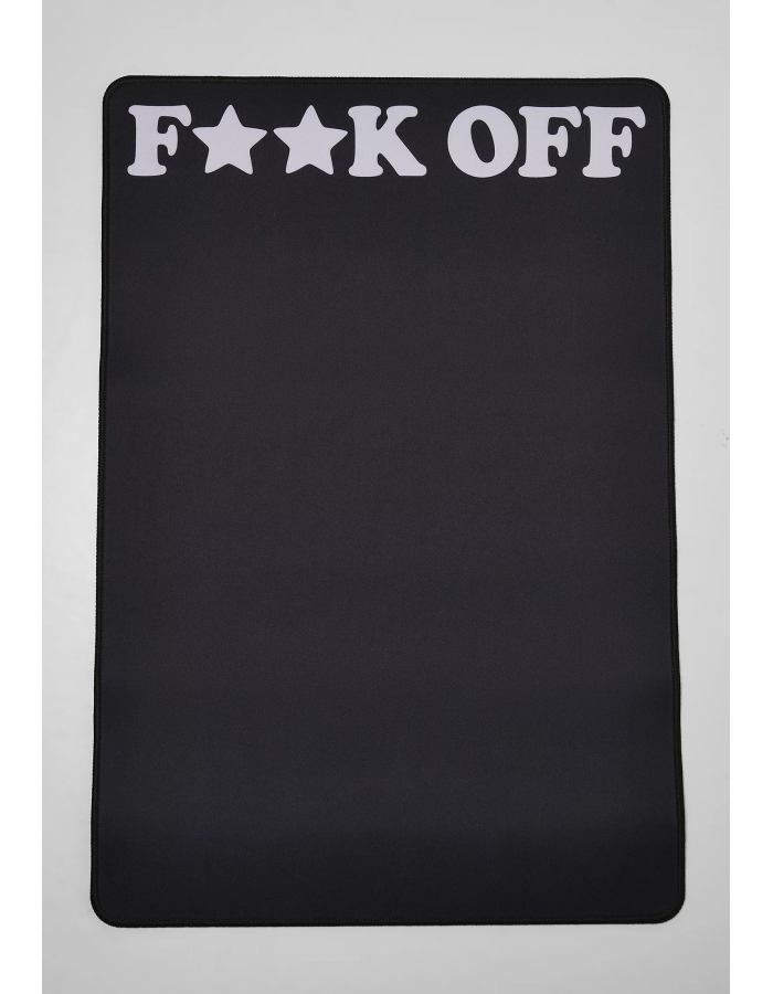 Obdélníková podložka na stůl má sytě černou barvu. Jednu stranu zdobí slova „Fuck off“. Obtížná podložka na stůl má rozměry 60 x 40 x 5 centimetrů a je vyrobena z robustní pryže.