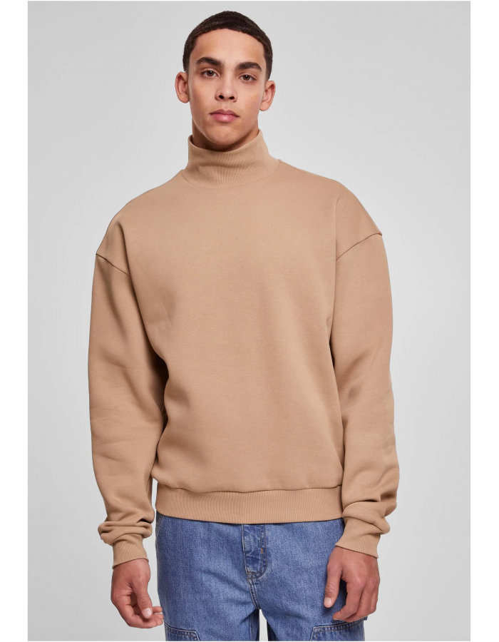 Pánský svetr s kulatým výstřihem nabízí jasný vzhled, který zahrnuje vysoký žebrovaný stojáček, oversize střih se spadlými rameny a sportovní žebrované manžety na rukávech a spodním lemu. Je vyrobena z česaného fleecu – hladké směsi polyester-bavlna.
