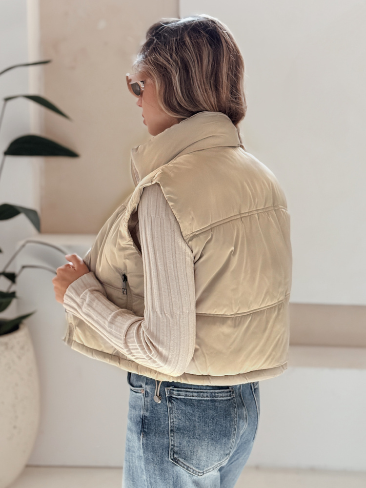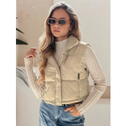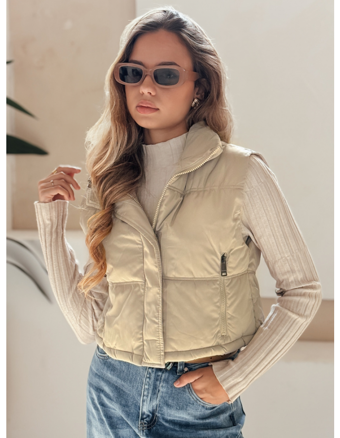 Krótka pikowana kamizelka z wysokim kołnierzem to uniwersalny element garderoby, który świetnie sprawdzi się w przejściowych stylizacjach. Minimalistyczny fason zapewnia wiele możliwości stylizacyjnych, a praktyczne detale wpływają na komfort noszenia.