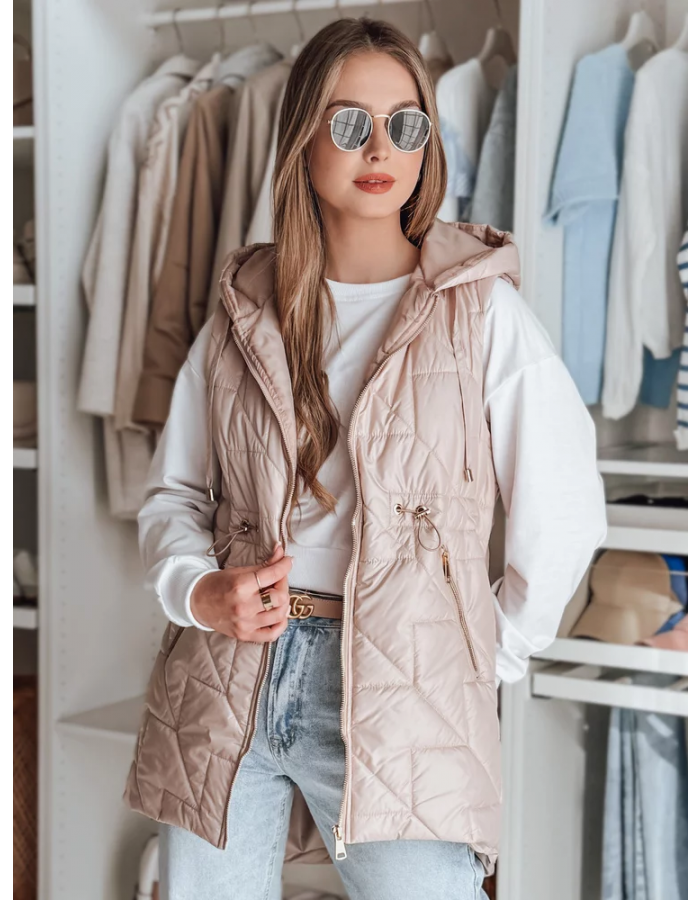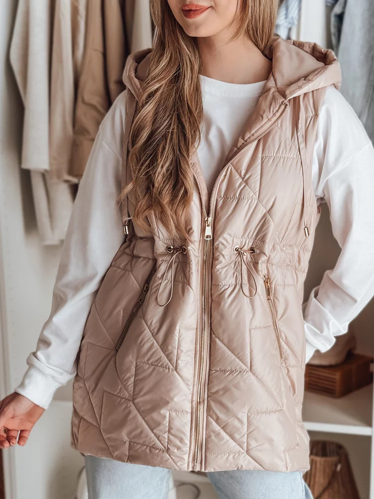 Stylowa kamizelka przejściowa to idealny wybór na zimniejsze warunki pogodowe. Model zapinany na suwak, z nieodpinanym kapturem i regulacją w talii dla lepszego dopasowania. Dwie ozdobne kieszenie dodają uroku, a ocieplenie zapewnia komfort noszenia. Modny, pikowany wzór podkreśla nowoczesny styl, idealna na każdą okazje.