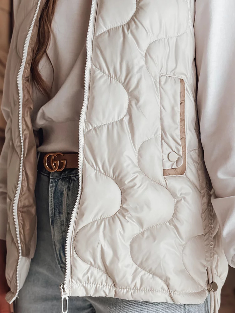 Stylowa kamizelka przejściowa z unikalnym pikowaniem, które dodaje charakteru. Wypełnienie zapewnia lekki komfort cieplny, a regulowane boki pozwalają na indywidualne dopasowanie. Model z odpinanym kapturem oraz ozdobnymi kieszeniami na drobiazgi. Idealna do warstwowych stylizacji w sezonie przejściowym.