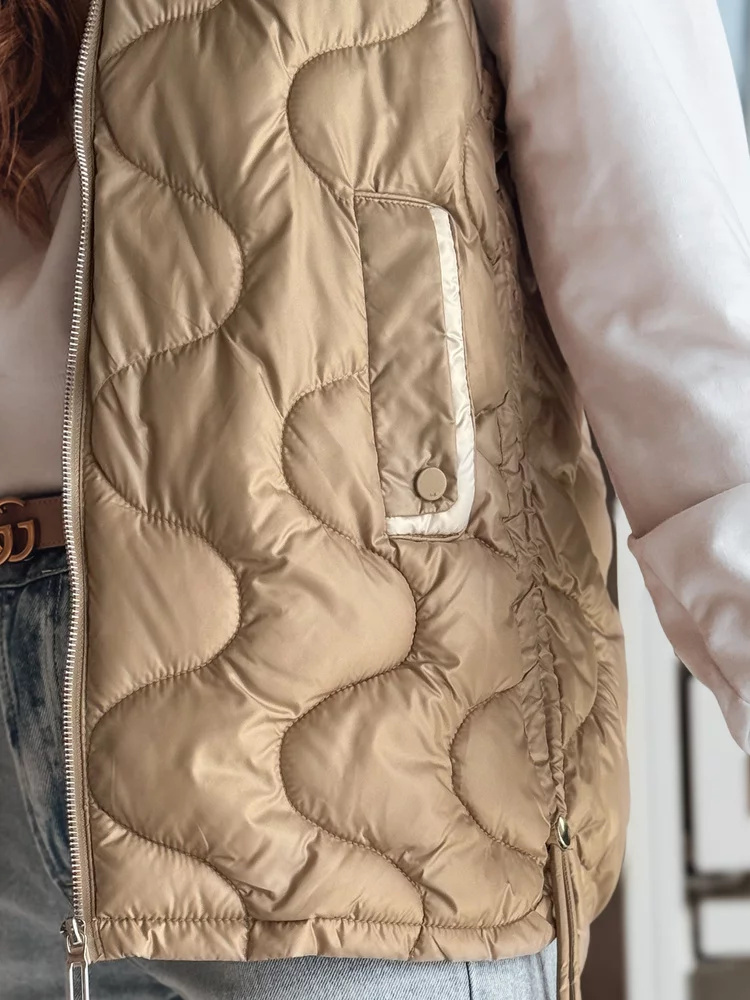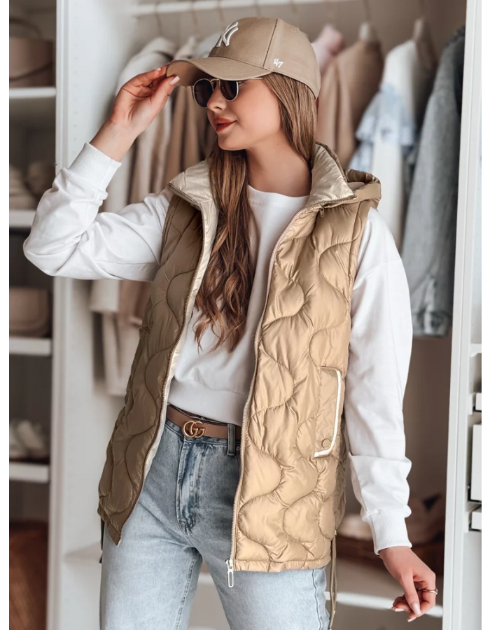 Stylowa kamizelka przejściowa z unikalnym pikowaniem, które dodaje charakteru. Wypełnienie zapewnia lekki komfort cieplny, a regulowane boki pozwalają na indywidualne dopasowanie. Model z odpinanym kapturem oraz ozdobnymi kieszeniami na drobiazgi. Idealna do warstwowych stylizacji w sezonie przejściowym.