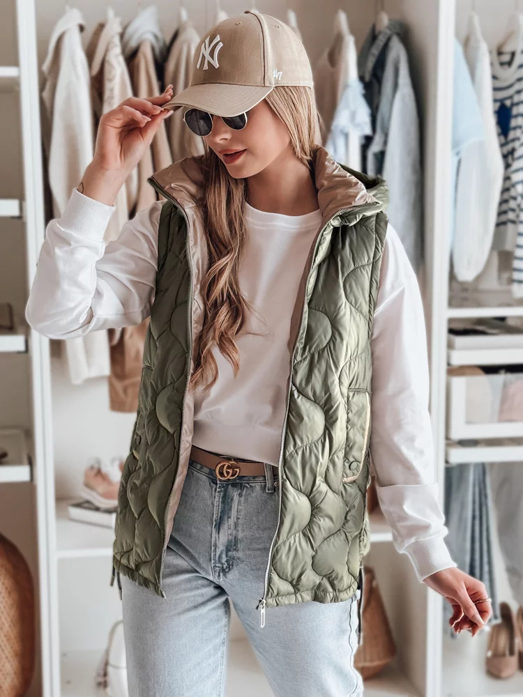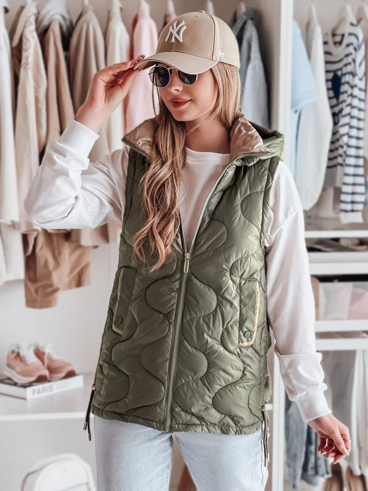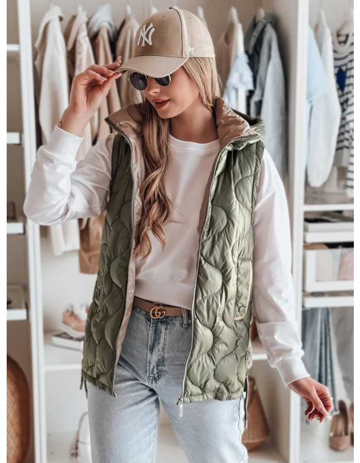 Stylowa kamizelka przejściowa z unikalnym pikowaniem, które dodaje charakteru. Wypełnienie zapewnia lekki komfort cieplny, a regulowane boki pozwalają na indywidualne dopasowanie. Model z odpinanym kapturem oraz ozdobnymi kieszeniami na drobiazgi. Idealna do warstwowych stylizacji w sezonie przejściowym.