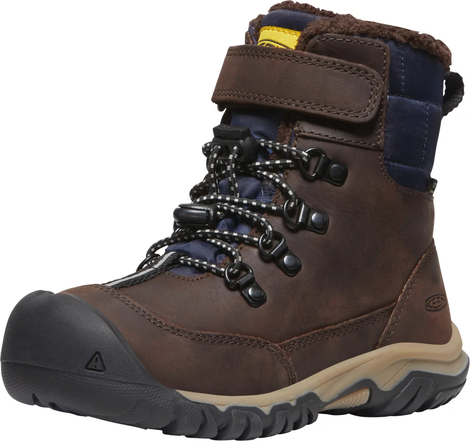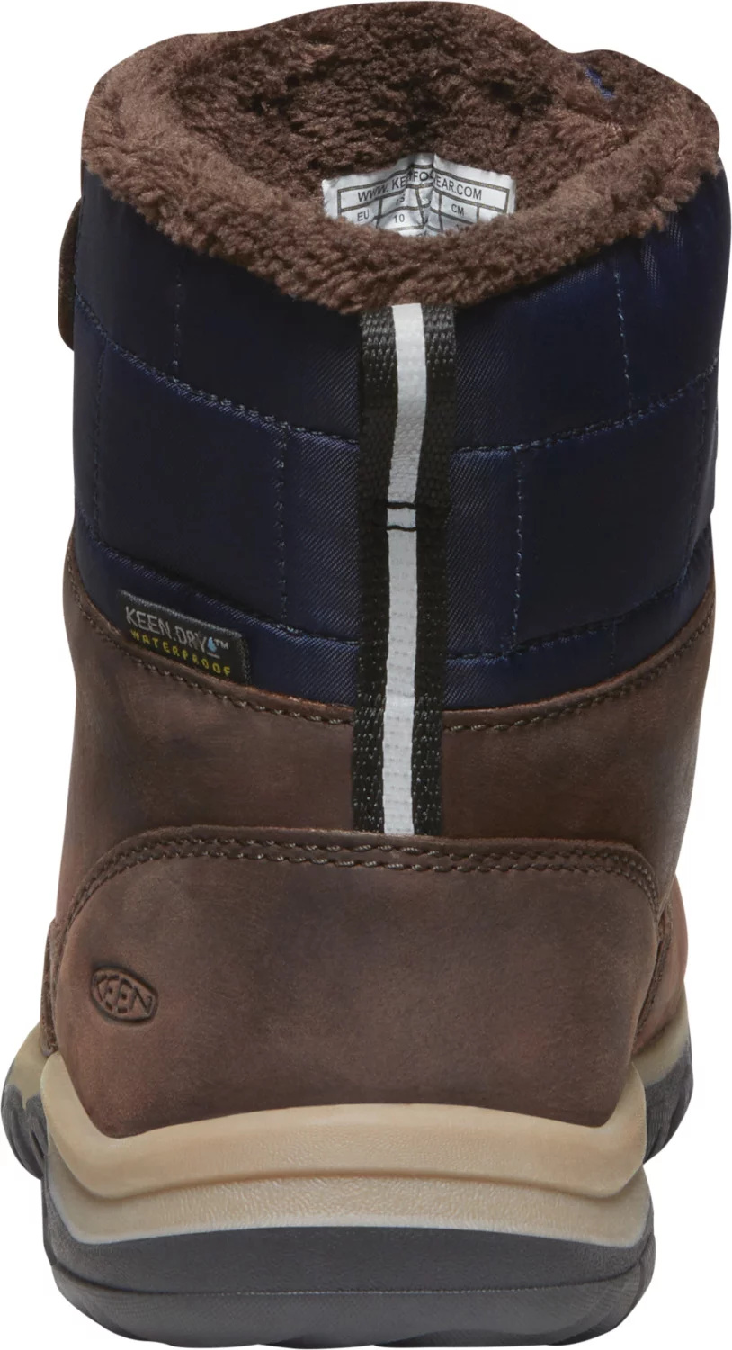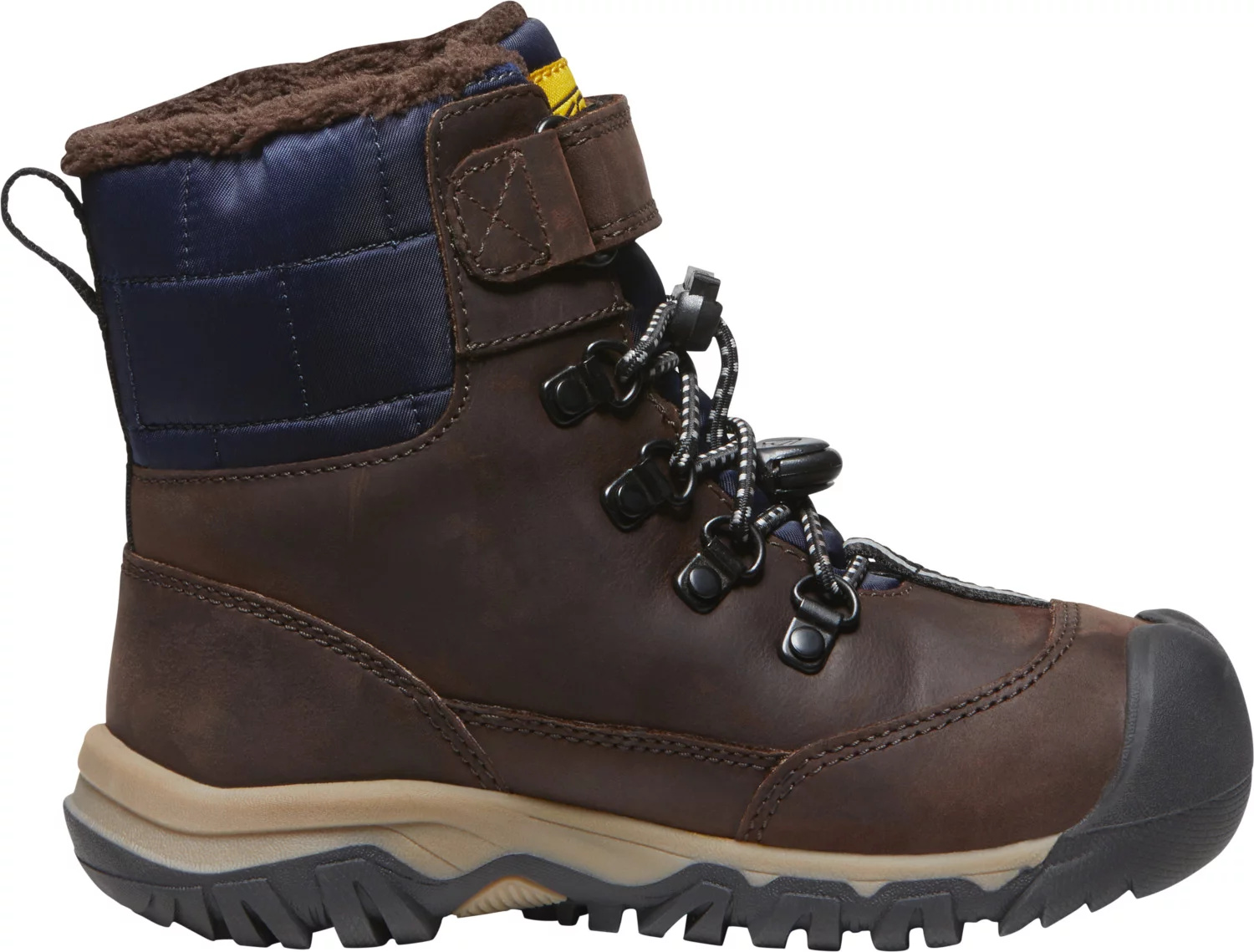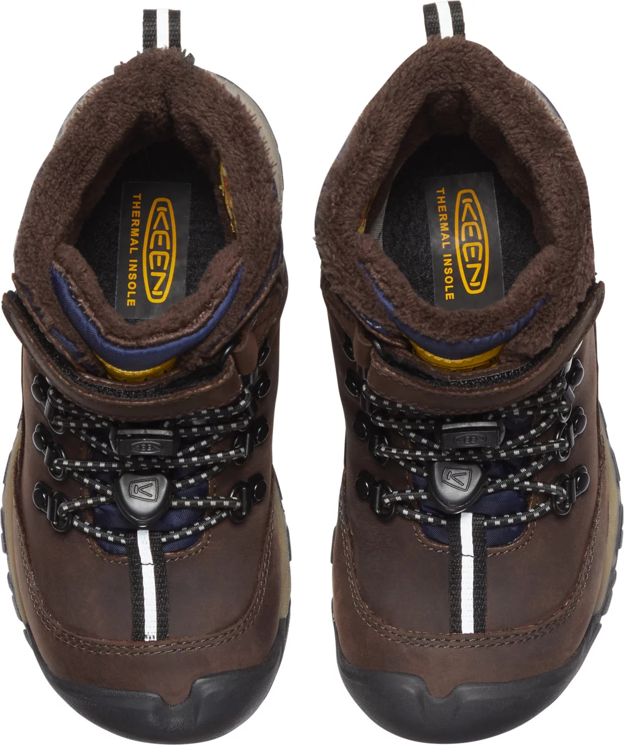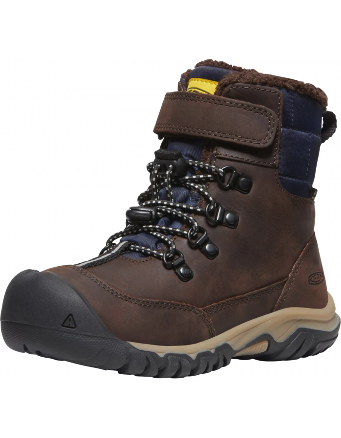 Kanibou WP jsou bohatě zateplené dětské zimní boty. Svrchní materiál je z kvalitní, voděodolné a ekologicky certifikované kůže, která společně s membránou KEEN.DRY a PFAS free impregnací přináší dokonalou ochranu i za mokra. O dostatečný tepelný komfort se postarají fleecová podšívka s vyšším chlupem, technologie KEEN.WARM až do -32 °C a stélka Thermal Heat Shield, která zachycuje teplo. Vnitřek boty je ošetřen ekologickou technologií ECO ODOR CONTROL omezující vznik zápachu. Gumová podešev KEEN.FUSION s kvalitním vzorkem zabrání nechtěnému uklouznutí, navíc je lehká a odolná. Bezproblémové obouvání zajistí šněrovací systém s lankem a páskem na suchý zip. Specifikace: nepromokavý svršek z kůže a textilu; šněrovací systém s lankem s nastavitelným popruhem s háčkem a smyčkou; fleecová podšívka pro vyšší tepelný komfort; stélka Thermal Heat Shield zachycuje teplo; gumová podešev KEEN.FUSION pro nízkou hmotnost a odolnost; nebarvící gumová podešev KEEN.FUSION; podrážka s vícesměrnými výstupky pro vyšší přilnavost; voděodolná, prodyšná membrána KEEN.DRY; 200 g izolace KEEN.WARM až do -32 °C; Eco Anti-Odor pro přirozenou kontrolu zápachu; voděodolná úprava DWR bez PFAS; prémiová kůže s ekologickým certifikátem