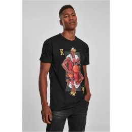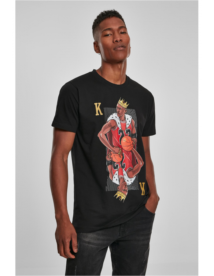 Poctěte krále basketbalu tímto ikonickým tričkem! Toto tričko s cool basketbalovým potiskem ve stylu hrací karty na přední straně je perfektním kouskem pro každého fanouška legendárního čísla 23. Motiv ukazuje Jeho Výsost slušící korunku, kožešinu a basketbalový míč.