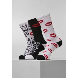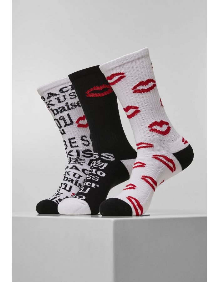 Design této sady tří párů ponožek se točí kolem motivu polibku. Ponožky jsou střiženy do výše lýtek a nabízejí kontrastní části špičky a paty. Dva návrhy obsahují slovo „kiss“ v různých jazycích a také celoplošný potisk líbacích úst, druhý zobrazuje líbající ústa na žeber a slovo „kiss“ v různých jazycích na zadní straně nohy. Ponožky mají úzkou manžetu a jsou vyrobeny z bavlny, polyesteru a spandexu. Jsou dostupné ve čtyřech různých velikostech.