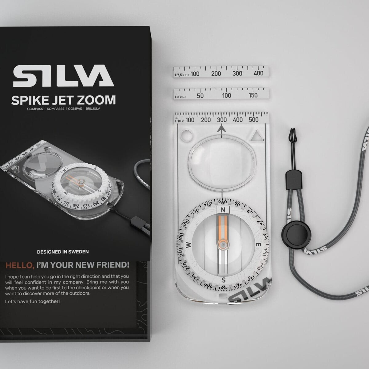 Silva Spike Jet Zoom je otočný deskový kompas pro orientační běh s nejvyšším výkonem a velkou lupou pro detailnější čtení mapy. Vybaven střelkou Jet 2.0 s rychlou stabilizací. Pro snadnější čtení vzdáleností na mapě jsou k dispozici vyměnitelné měřítka 1:40 000, 1:15 000, 1:10 000, 1:7 500, 1:3 000 a 1:4 000.