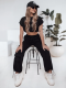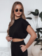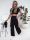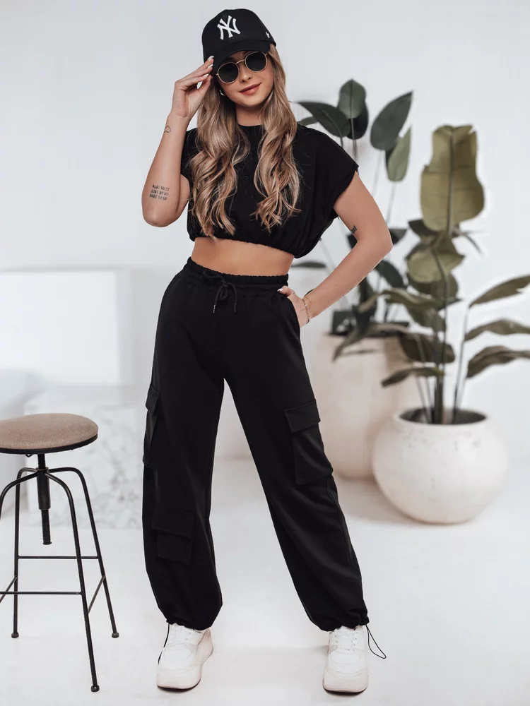 Stylowy komplet o luźnym kroju, który łączy wygodę z nowoczesnym designem. Spodnie z ozdobnymi kieszeniami oraz krótki top z elastycznym wykończeniem w formie gumki na dole zapewniają doskonałe dopasowanie. Spodnie posiadają wiązanie w tali oraz regulacje na dołach nogawek. Idealny wybór na codzienne aktywności i miejskie stylizacje. Łatwy do łączenia z innymi elementami garderoby.