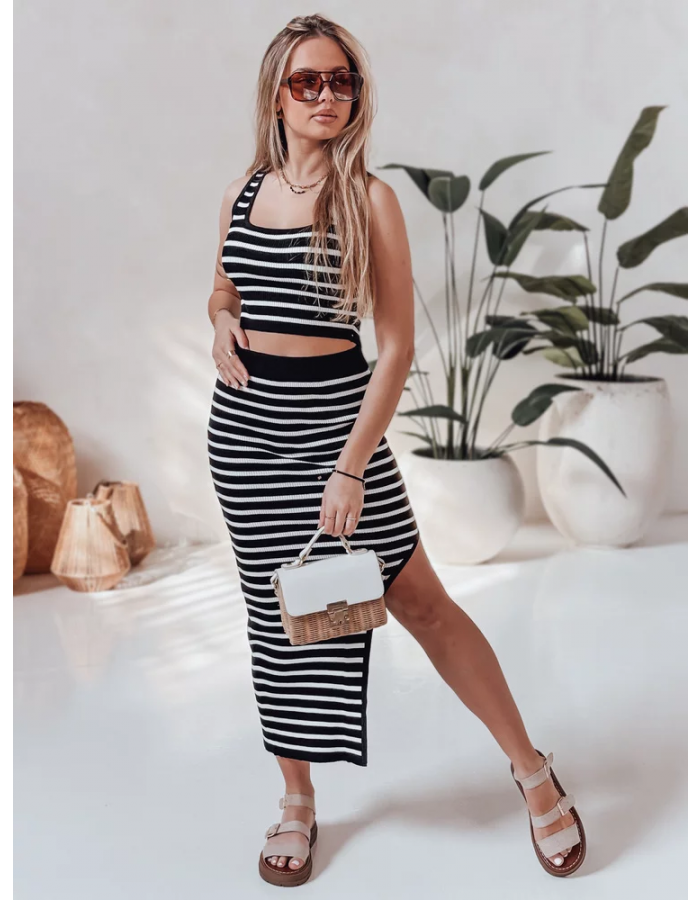 Damski komplet prążkowany to idealna propozycja na cieplejsze dni. Krótki top z grubszymi ramiączkami i klasycznym dekoltem prezentuje się nowocześnie, a dopasowana spódnica maxi z wysokim stanem oraz efektownym rozcięciem dodaje charakteru. Wzór w paski optycznie wysmukla sylwetkę. Uniwersalny rozmiar pasuje od XS do L. Materiał jest przyjemny w dotyku, elastyczny i doskonale dopasowuje się do ciała, zapewniając swobodę noszenia w ciepłe dni.