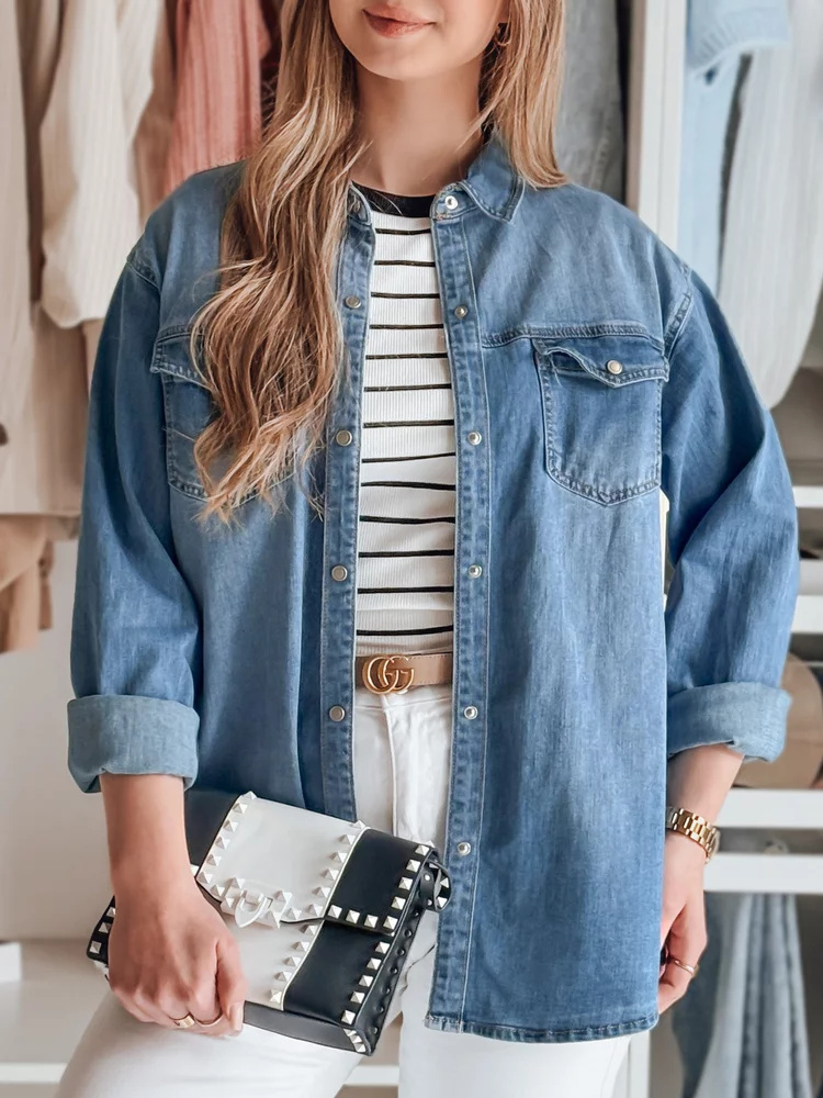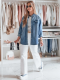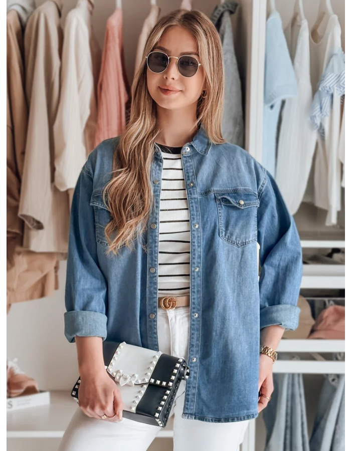 Stylowa koszula jeansowa oversize to idealna propozycja dla miłośniczek swobodnych, ale modnych stylizacji. Wykonana z miękkiego denimu, zapinana na modne napy. Model z długim rękawem i regulowanym mankietem. Posiada dwie kieszenie na piersi oraz lekko wydłużony tył, co dodaje jej nowoczesnego charakteru. Świetnie wygląda zarówno z klasycznymi jeansami, jak i wygodnymi legginsami.