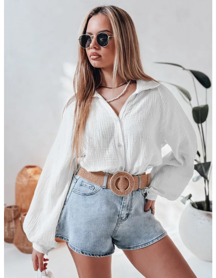 Muślinowa koszula damska o lekkiej strukturze została zaprojektowana z myślą o codziennym komforcie i swobodnym stylu. Naturalna bawełna zapewnia przewiewność oraz przyjemne odczucie na skórze. Luźniejszy krój pozwala na wygodne dopasowanie do sylwetki bez ograniczania ruchów. Klasyczna forma sprawdza się w wielu stylizacjach.