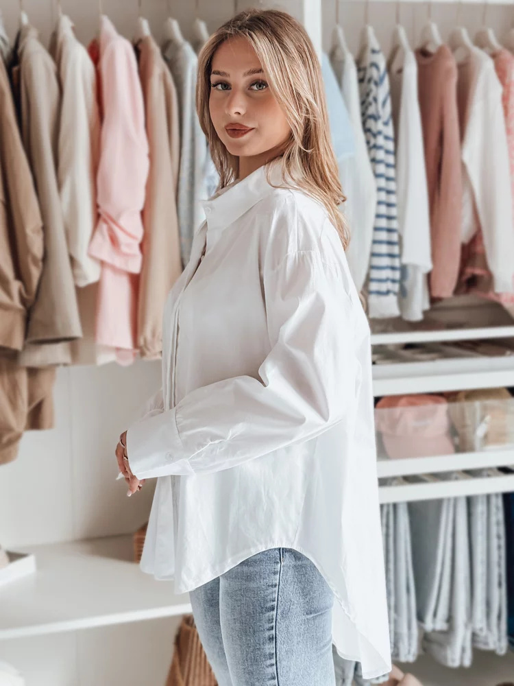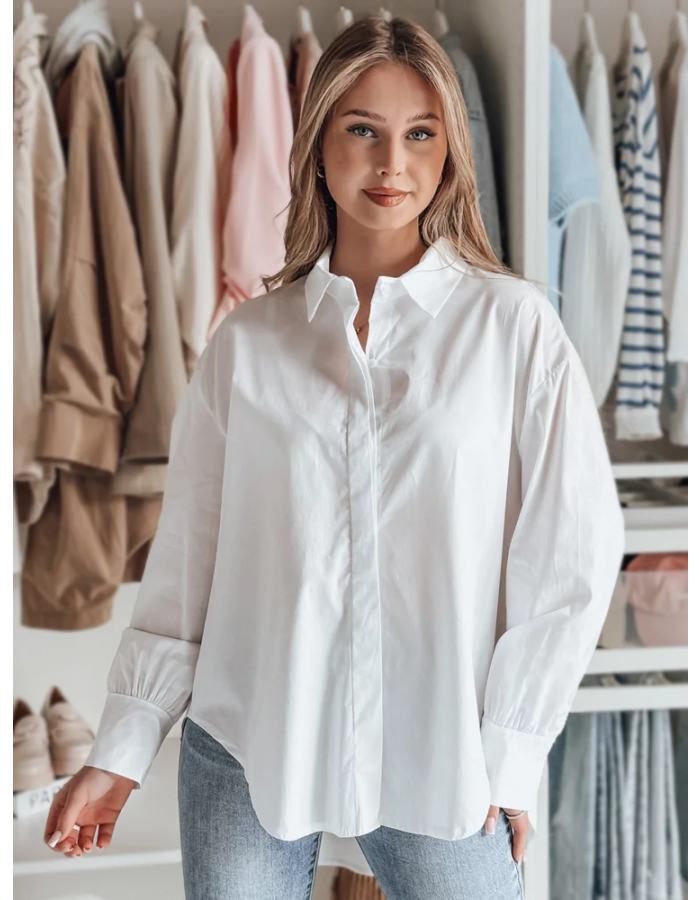 Elegancka i wygodna koszula oversize z przedłużonym tyłem to doskonały wybór na każdą okazję. Luźny krój podkreśla stylowy charakter, a guziki pozwalają na indywidualne dopasowanie. Rękawy zakończone klasycznym mankietem z guzikiem dodają szyku. Świetnie komponuje się zarówno ze spodniami, jak i spódnicami, tworząc modny look.