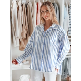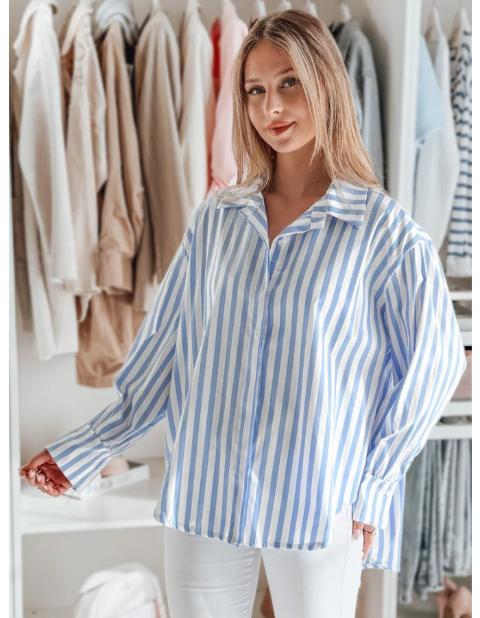 Koszula damska oversize z przedłużonym tyłem, zapinana na guziki. Luźny fason doskonale układa się na sylwetce, zapewniając wygodę przez cały dzień. Długie rękawy z mankietami na guziki dodają klasy, a wzór w paski wpisuje się w ponadczasowe trendy. Idealna baza do wielu stylizacji.