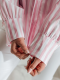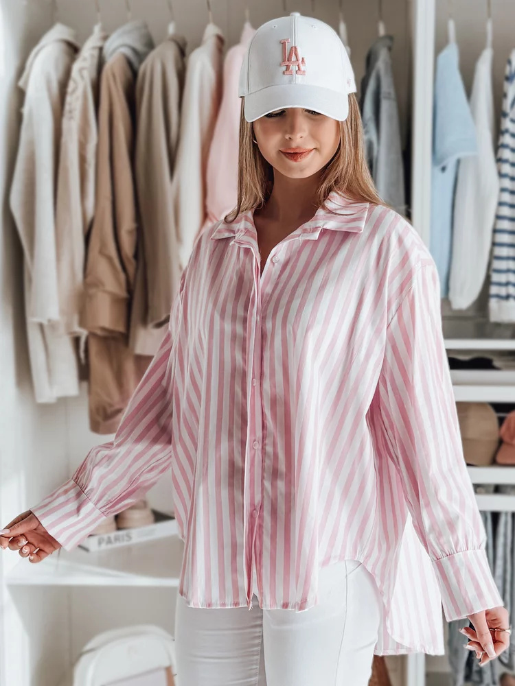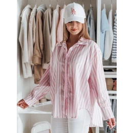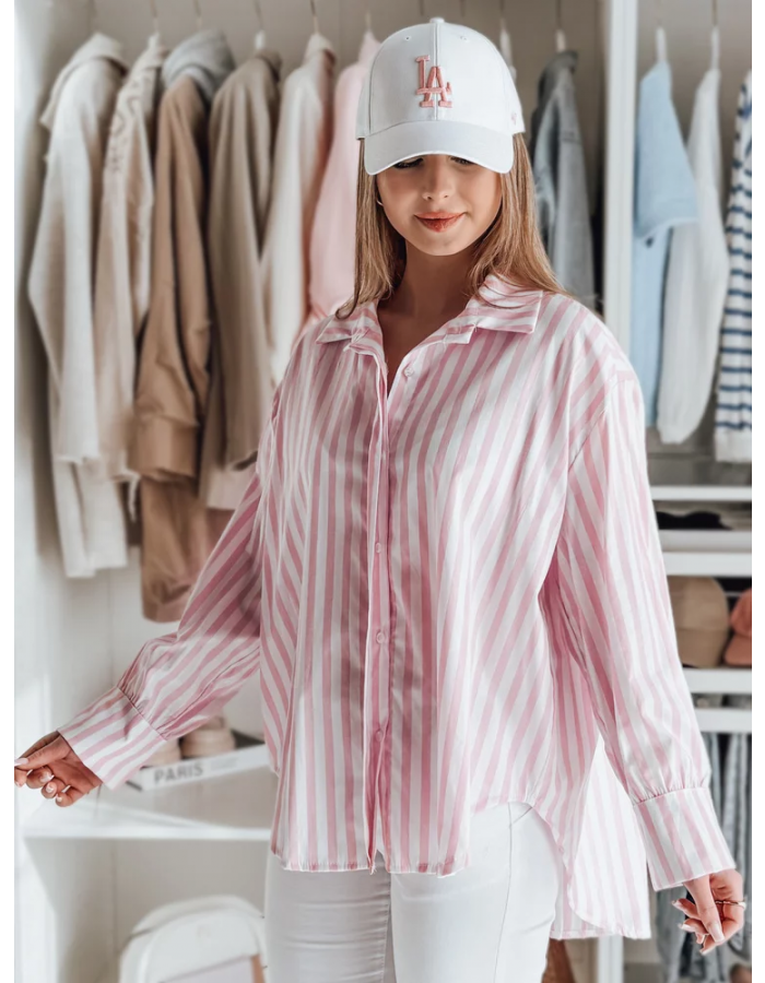 Koszula damska oversize z przedłużonym tyłem, zapinana na guziki. Luźny fason doskonale układa się na sylwetce, zapewniając wygodę przez cały dzień. Długie rękawy z mankietami na guziki dodają klasy, a wzór w paski wpisuje się w ponadczasowe trendy. Idealna baza do wielu stylizacji.