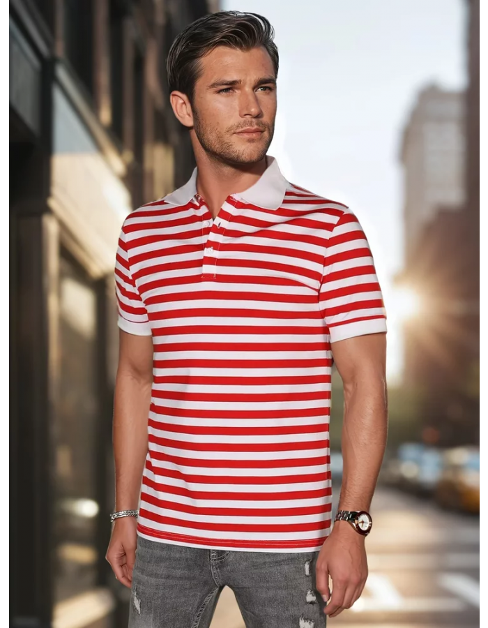 Koszulka polo męska w paski to klasyczny model z nowoczesnym twistem. Wykonana z miękkiego, przyjemnego w dotyku materiału, gwarantuje komfort noszenia przez cały dzień. Posiada zapięcie na guziki i dopasowany, ale swobodny krój, który świetnie układa się na sylwetce. Idealna na co dzień, jak i półformalne okazje w cieplejsze dni sezonu wiosennego oraz letniego.