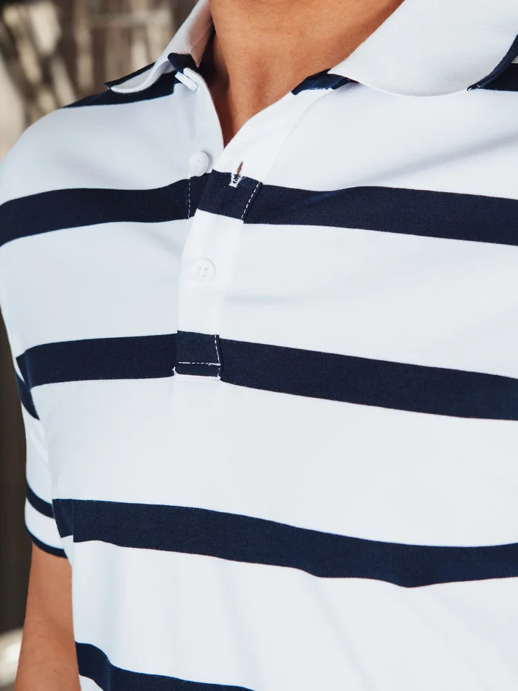 Męska koszulka polo w ponadczasowe paski to świetne połączenie stylu i wygody. Model o klasycznym kroju i kołnierzyku zapinanym na guziki doskonale sprawdza się w codziennych stylizacjach. Miękka tkanina zapewnia komfort noszenia, a uniwersalny wzór świetnie komponuje się z jeansami i sneakersami.
