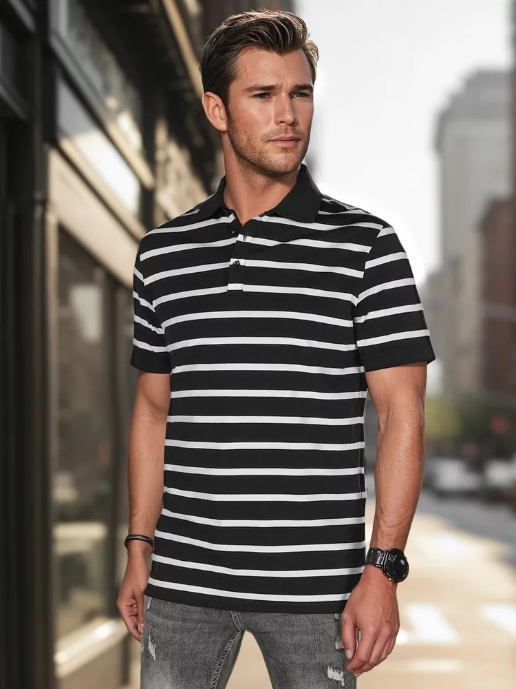 Koszulka polo męska o ponadczasowym fasonie, wykonana z miękkiego i przewiewnego materiału, który doskonale sprawdza się w cieplejsze dni. Klasyczny krój zapewnia komfort noszenia, a poziome paski i zapięcie na guziki dodają całości nowoczesnego stylu. Koszulka idealna na co dzień oraz do miejskich stylizacji. Świetna na sezon wiosenny.