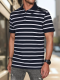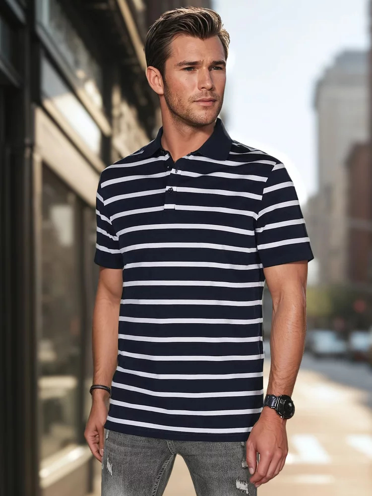 Koszulka polo męska o ponadczasowym fasonie, wykonana z miękkiego i przewiewnego materiału, który doskonale sprawdza się w cieplejsze dni. Klasyczny krój zapewnia komfort noszenia, a poziome paski i zapięcie na guziki dodają całości nowoczesnego stylu. Koszulka idealna na co dzień oraz do miejskich stylizacji. Świetna na sezon wiosenny.
