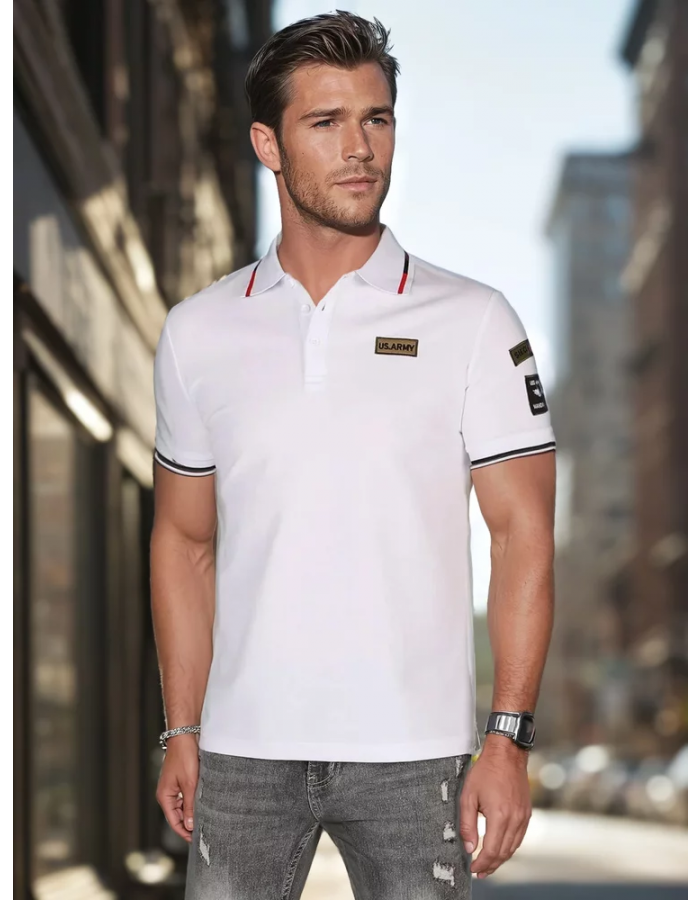 Nowoczesna koszulka polo dla mężczyzn, którzy stawiają na komfort i design. Wzbogacona naszywkami w stylu wojskowym, świetnie wpisuje się w casualowy i uliczny look. Klasyczne zapięcie na guziki oraz dopracowany krój sprawiają, że sprawdzi się idealnie w sezonie wiosennym.