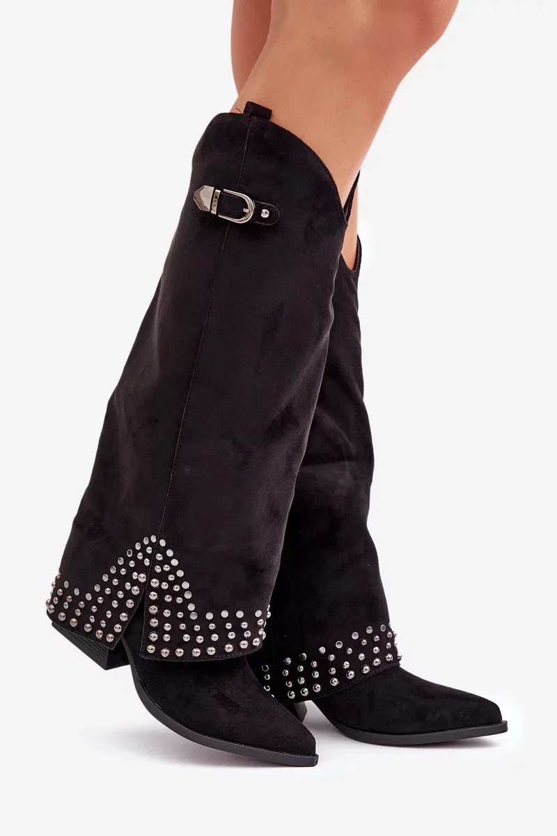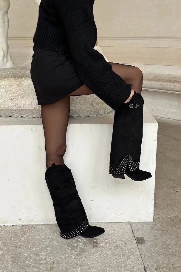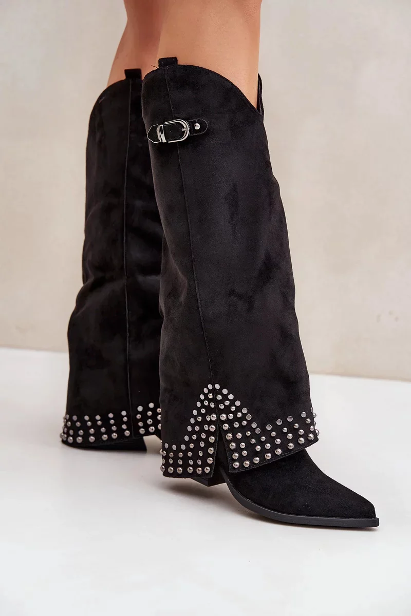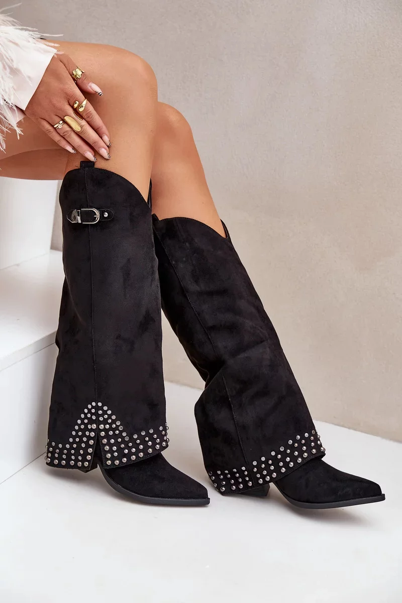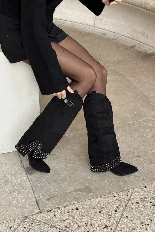 Stylové dámské kotníkové boty vyrobené z eko semiše. Model se vyznačuje ohrnutým svrškem ozdobeným cvočky a elegantní sponou. Špičaté špičky dodávají obuvi eleganci a zdůrazňují její výjimečný design. Ideální volba pro ženy, které si cení módy a originality v každodenních stylizacích. Při výběru velikosti se prosím řiďte tabulkou velikostí.