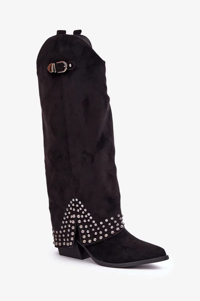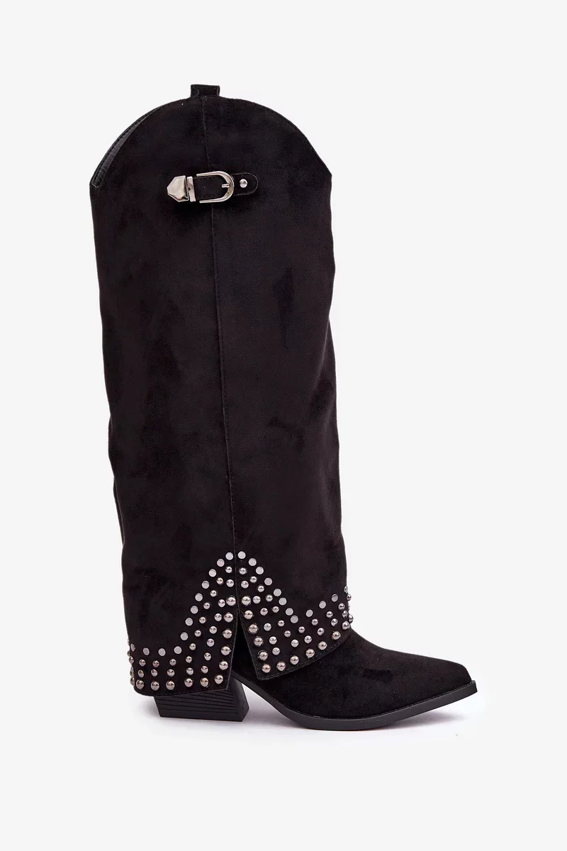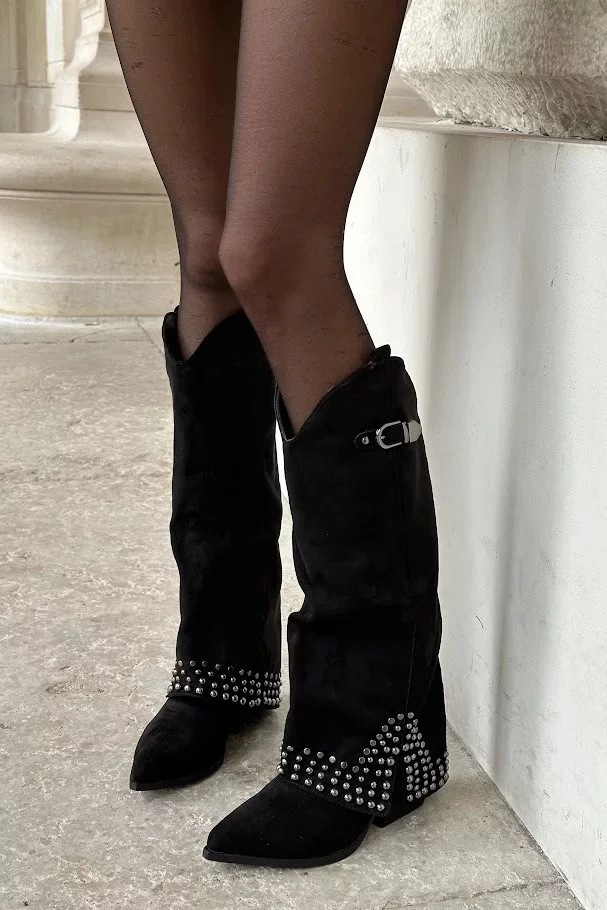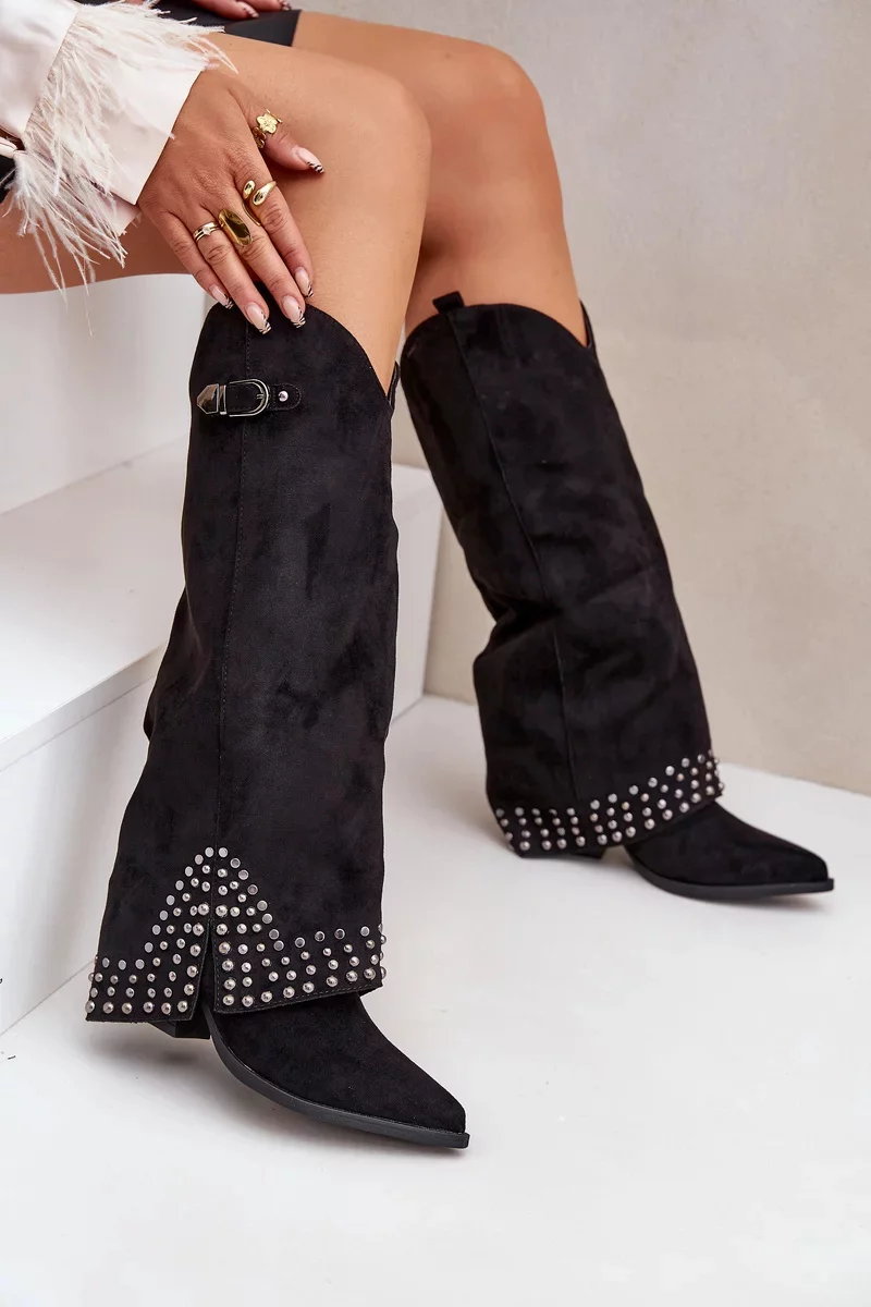 Stylové dámské kotníkové boty vyrobené z eko semiše. Model se vyznačuje ohrnutým svrškem ozdobeným cvočky a elegantní sponou. Špičaté špičky dodávají obuvi eleganci a zdůrazňují její výjimečný design. Ideální volba pro ženy, které si cení módy a originality v každodenních stylizacích. Při výběru velikosti se prosím řiďte tabulkou velikostí.