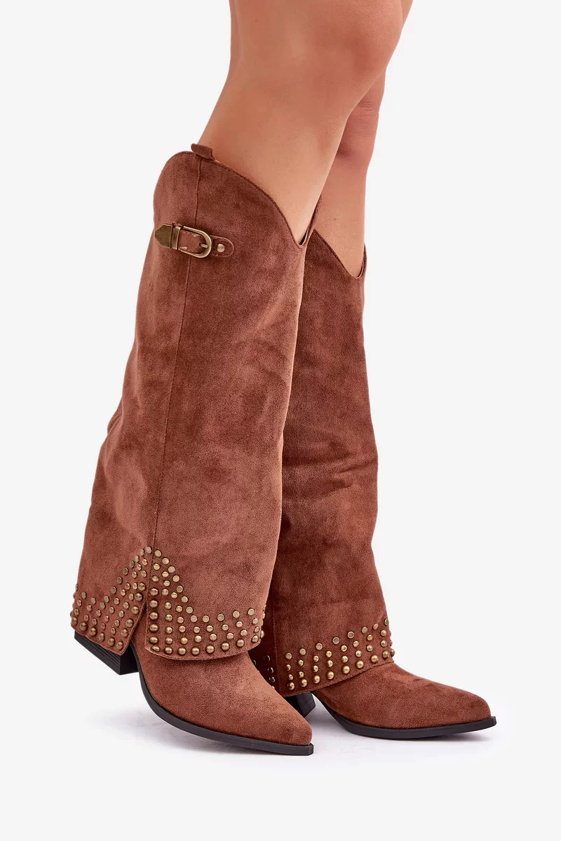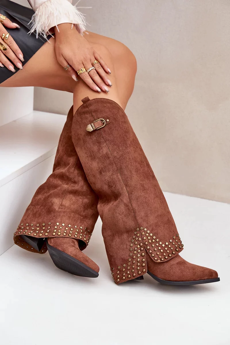 Stylové dámské kotníkové boty vyrobené z eko semiše. Model se vyznačuje ohrnutým svrškem ozdobeným cvočky a elegantní sponou. Špičaté špičky dodávají obuvi eleganci a zdůrazňují její výjimečný design. Ideální volba pro ženy, které si cení módy a originality v každodenních stylizacích. Při výběru velikosti se prosím řiďte tabulkou velikostí.