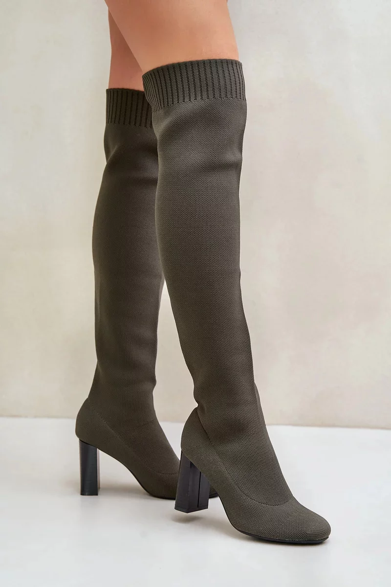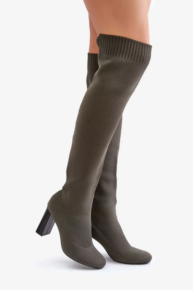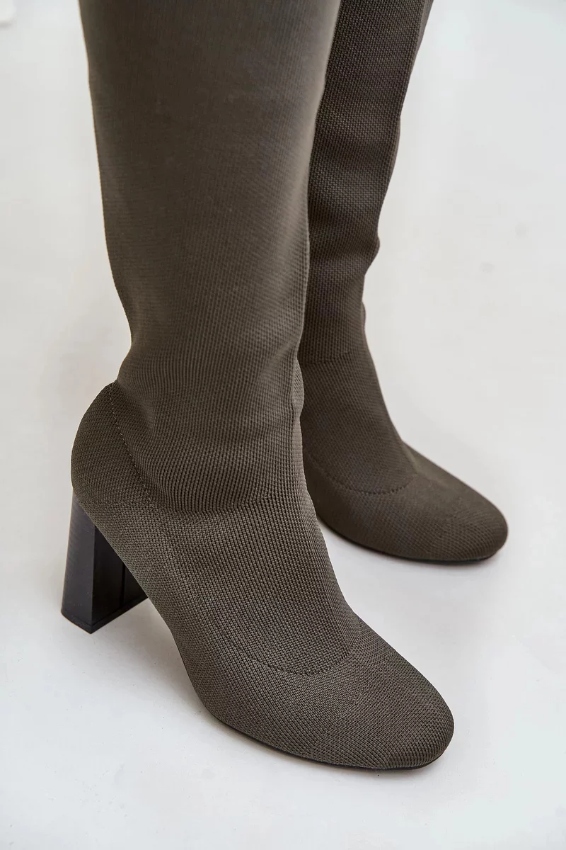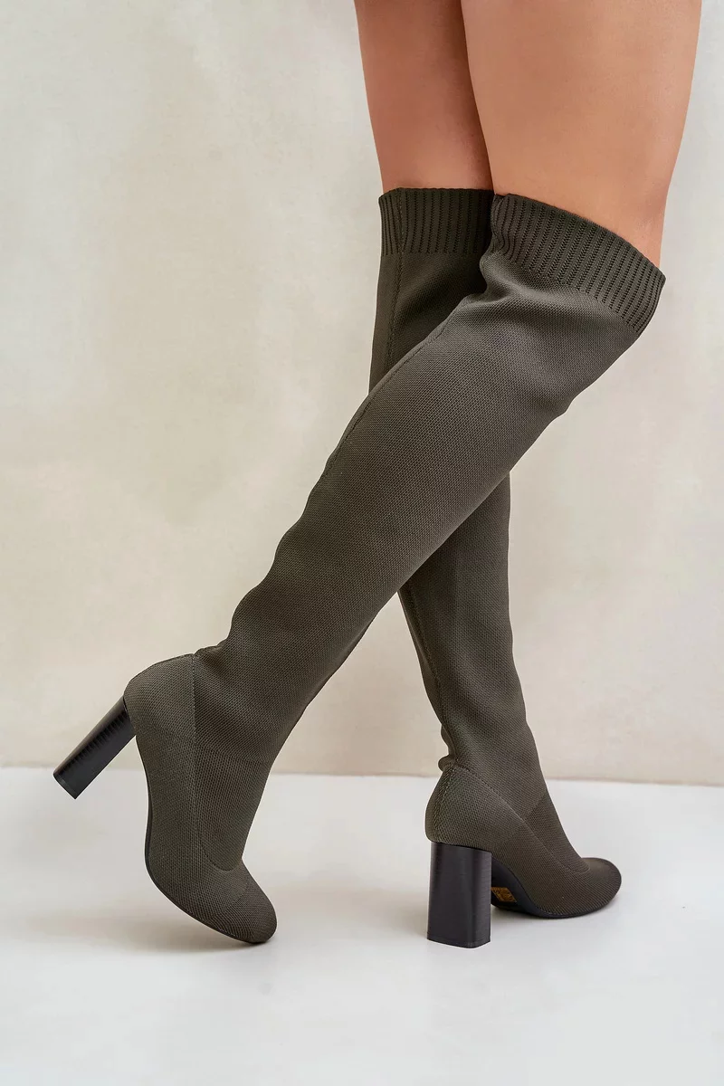 Kozačky s ponožkovým svrškem nad kolena na podpatku tmavě zelené Esanira 38