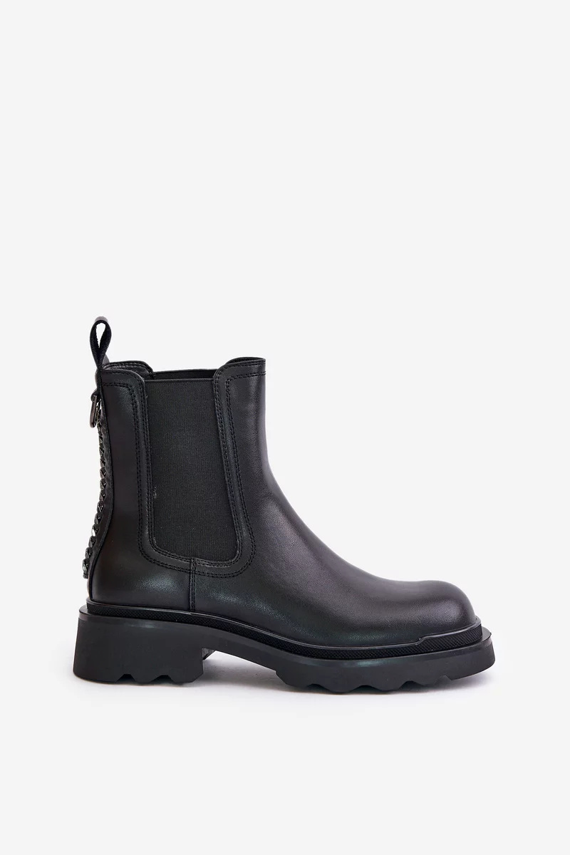 Dámské nazouvací kotníkové boty vyrobené z přírodní kůže. Osazené na plochém podpatku. Zaoblené špičky. Vnitřek zateplený obuvnickou dekou. Tento model se vyznačuje ozdobným řetízkem vzadu. Při výběru velikosti se prosím řiďte tabulkou velikostí.