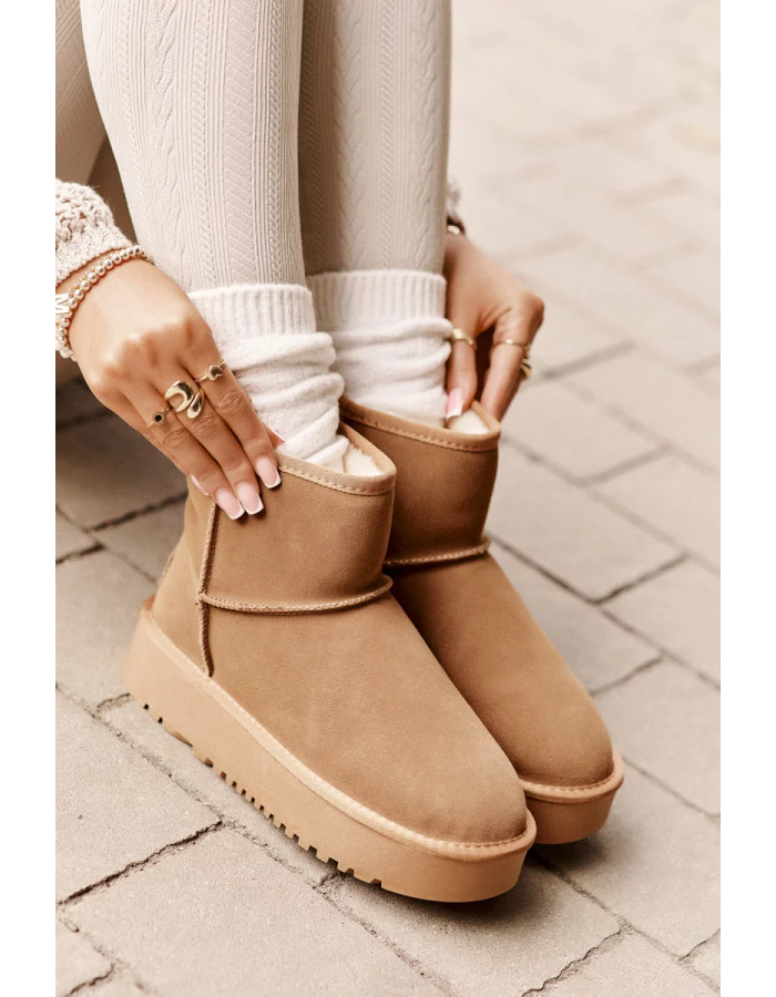 Vyrobeno z přírodní semiše, zajišťuje eleganci a trvanlivost. Vnitřek bot je vyložen teplým, hustým kožíškem, který zaručuje pohodlí i při nízkých teplotách. Osazené na platformě, účinně chrání před chladem podkladu. To je povinný kousek ve tvém zimním šatníku! Při výběru velikosti se prosím řiďte tabulkou velikostí.