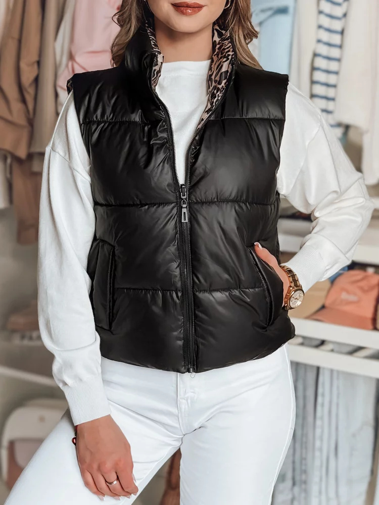 Kamizelka przejściowa damska o dwustronnym designie, łącząca klasykę z modnym akcentem. Ozdobne kieszenie wewnętrzne i zewnętrzne dodają uroku i funkcjonalności, a regulowany dół pozwala na idealne dopasowanie. Zapinana na zamek, bez kaptura, z lekkim ociepleniem, które zapewnia komfort w chłodniejsze dni. Model idealny na okres przejściowy, pasuje do wielu stylizacji.