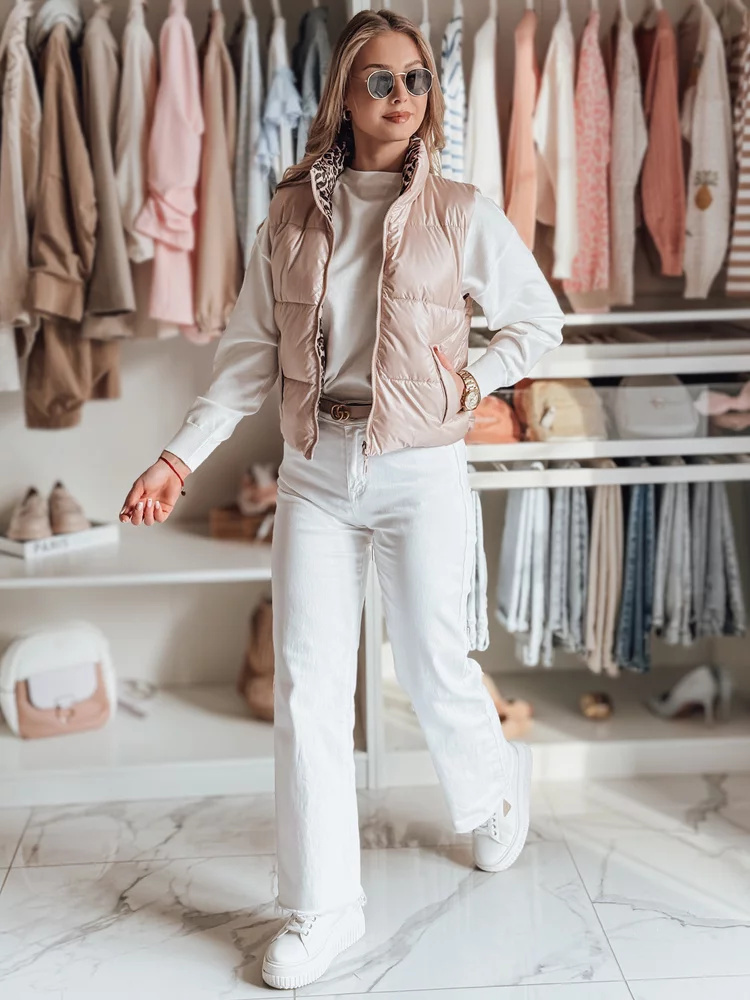 Kamizelka przejściowa damska o dwustronnym designie, łącząca klasykę z modnym akcentem. Ozdobne kieszenie wewnętrzne i zewnętrzne dodają uroku i funkcjonalności, a regulowany dół pozwala na idealne dopasowanie. Zapinana na zamek, bez kaptura, z lekkim ociepleniem, które zapewnia komfort w chłodniejsze dni. Model idealny na okres przejściowy, pasuje do wielu stylizacji.