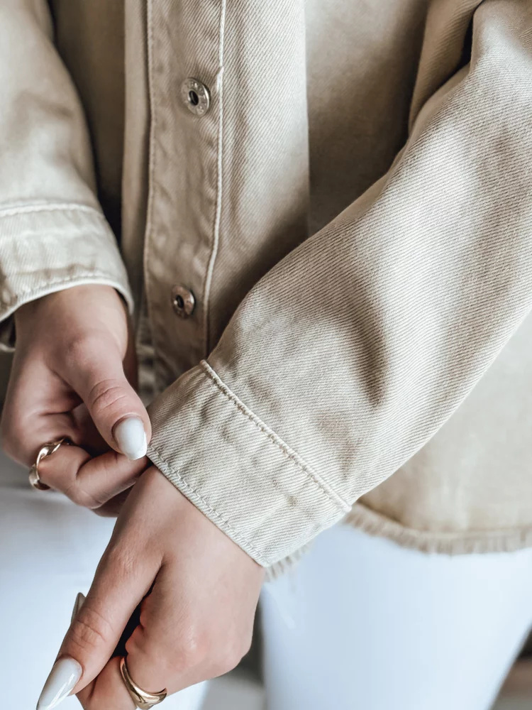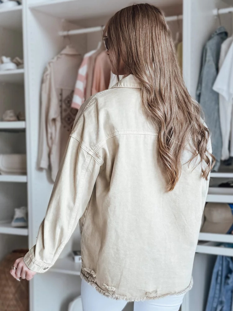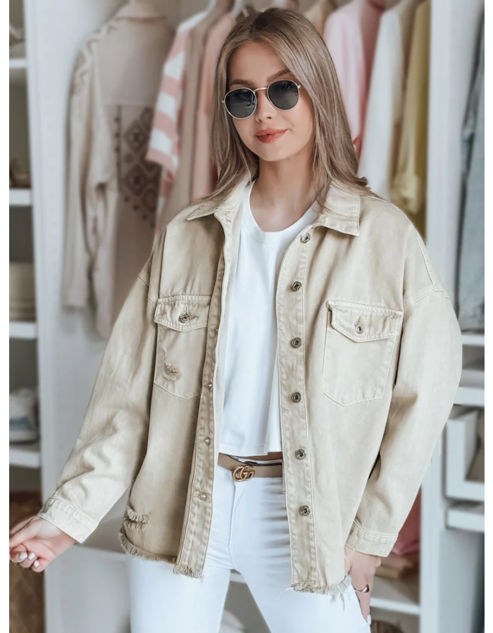 Jeansowa kurtka oversize z efektem spranego denimu i ozdobnymi przetarciami. Model posiada zapinane kieszenie na piersi oraz guziki na całej długości. Ozdobne przetarcia oraz postrzępione wykończenie nadają jej modowego charakteru. Regulowane mankiety pozwalają dopasować rękawy do stylizacji. Idealna do casualowych na okres przejściowy.