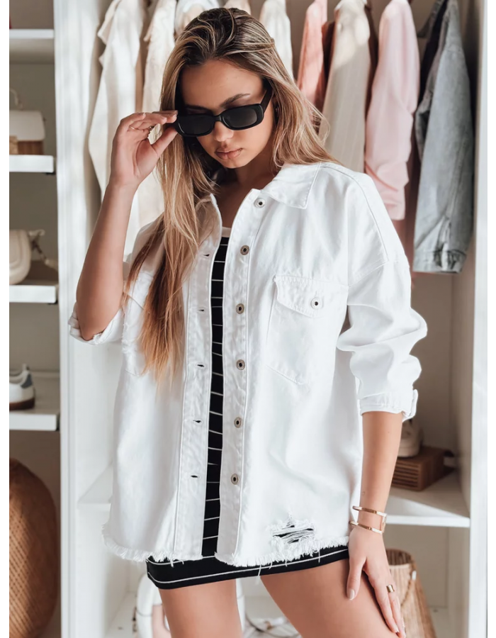 Jeansowa kurtka oversize z efektem spranego denimu i ozdobnymi przetarciami. Model posiada zapinane kieszenie na piersi oraz guziki na całej długości. Ozdobne przetarcia oraz postrzępione wykończenie nadają jej modowego charakteru. Regulowane mankiety pozwalają dopasować rękawy do stylizacji. Idealna do casualowych na okres przejściowy.