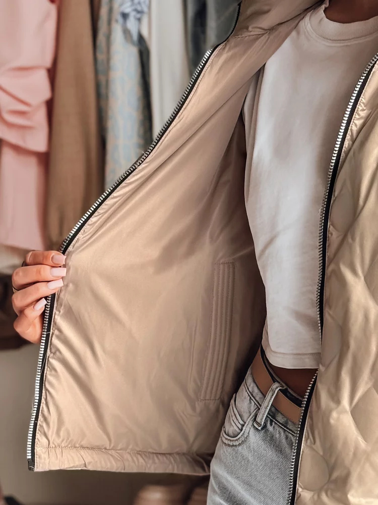 Dwustronna kurtka przejściowa łączy nowoczesność z modnym designem. Wygodny, odpinany kaptur i regulacja na dole zapewniają idealne dopasowanie. Dwie kieszenie zewnętrzne i dwie wewnętrzne dodają praktyczności. Uniwersalny fason sprawdzi się w codziennych stylizacjach, podkreślając nowoczesny look.