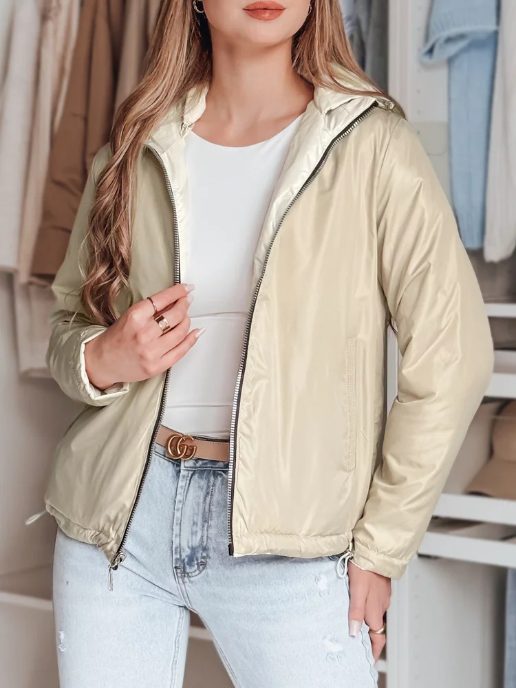 Dwustronna kurtka przejściowa łączy nowoczesność z modnym designem. Wygodny, odpinany kaptur i regulacja na dole zapewniają idealne dopasowanie. Dwie kieszenie zewnętrzne i dwie wewnętrzne dodają praktyczności. Uniwersalny fason sprawdzi się w codziennych stylizacjach, podkreślając nowoczesny look.
