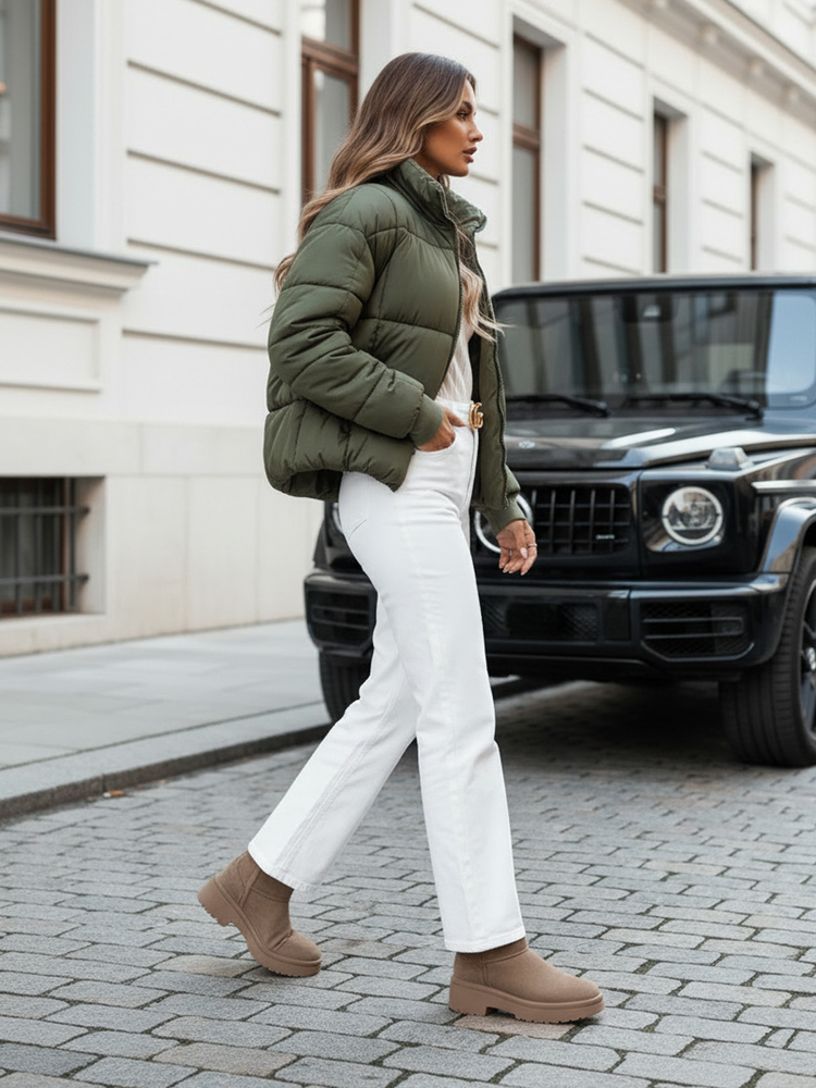 Modna kurtka damska typu puffer z grubym kołnierzem i przeszyciami to stylowa ochrona przed zimnem. Praktyczne kieszenie i zamek błyskawiczny zapewniają wygodę. Minimalistyczny fason pasuje do wielu stylizacji. Sprawdzi się świetnie jako okrycie wierzchnie w sezonie jesiennym i zimowym.