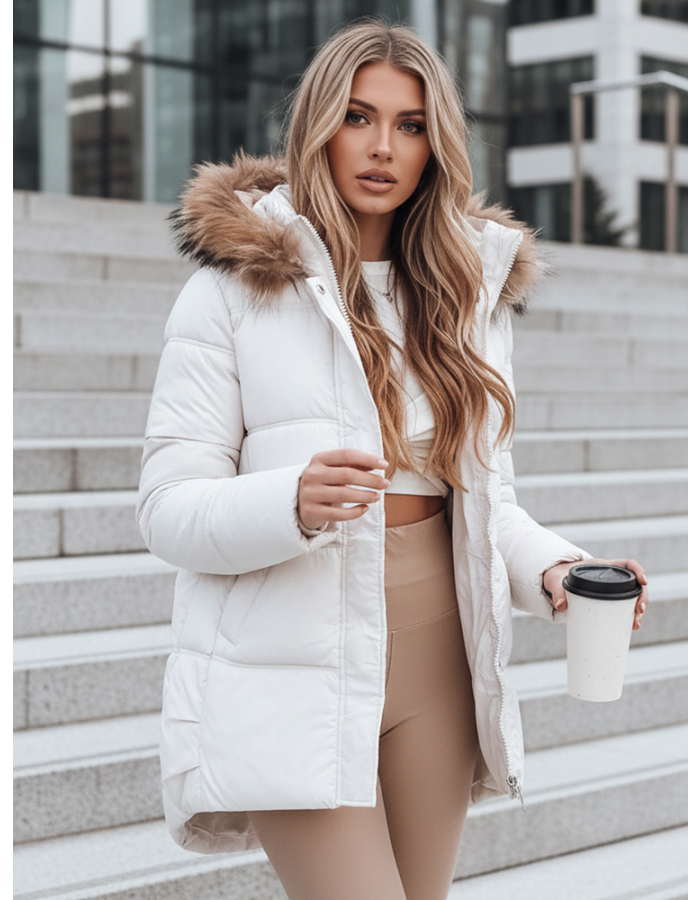 Model łączy lekką konstrukcję z ciepłym wypełnieniem, zapewniając komfort w trakcie codziennego użytkowania w sezonie zimowym. Pikowany materiał stabilizuje ocieplenie, a subtelnie zaokrąglony dół nadaje kurtce nowoczesny charakter. Ocieplany kaptur z futerkiem zwiększa ochronę przed chłodem, a jednocześnie podkreśla kobiecy wygląd.