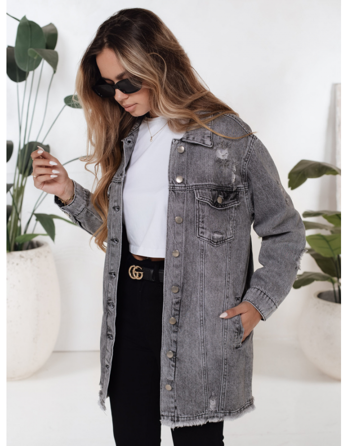 Jeansowa kurtka XENIA to HIT nadchodzącego sezonu. Model o dłuższym kroju surowo zakończony poszarpanym dołem. Model Xenia wyróżnia się licznymi przetarciami z przodu i z tyłu. Kurtka zapinana jest na guziki, posiada dwie kieszenie z przodu.