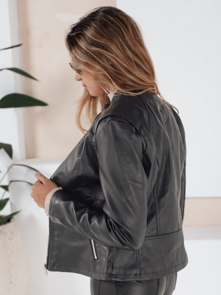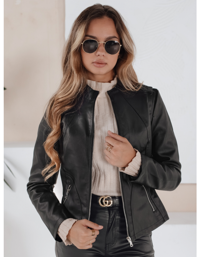 Stylowa damska kurtka TY5201 przejściowa wykonana z wysokiej jakości eko-skóry, idealna na sezon wiosenno-jesienny. Dopasowany krój typu slim fit podkreśla sylwetkę, a kołnierz typu stójka nadaje całości nowoczesnego charakteru. Dwie boczne kieszenie na zamek zapewniają funkcjonalność, a podszewka zwiększa komfort noszenia.