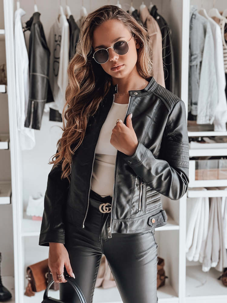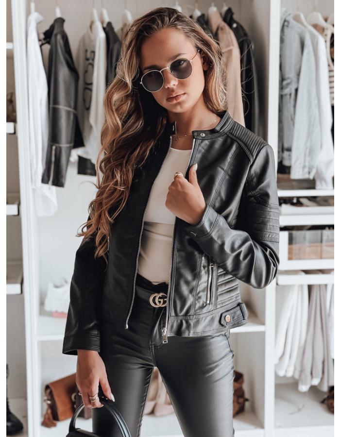 Modna kurtka motocyklowa z ekoskóry o kobiecym fasonie i ozdobnych przeszyciach. Zapinana na zamek, z wysoką stójką i kieszeniami z przodu, świetnie podkreśla talię. Sprawdzi się w stylizacjach casualowych i miejskich. Idealna na wiosenne i jesienne dni jako alternatywa dla marynarki lub płaszcza.