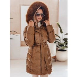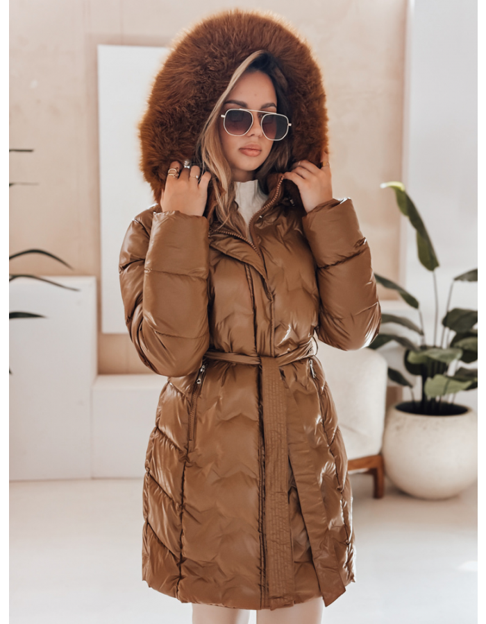 Długa pikowana kurtka zimowa z paskiem podkreślającym talię i kapturem obszytym miękkim futerkiem. Zapewnia skuteczną ochronę przed zimnem i wiatrem, a jednocześnie wygląda stylowo i kobieco. Idealna na chłodniejsze dni, zarówno do miejskich, jak i casualowych stylizacji.