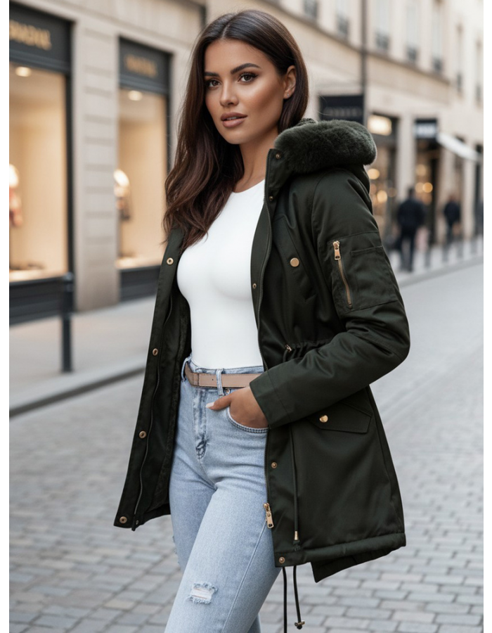 Nowoczesna parka pikowana ERISS dla kobiet, które cenią sobie elegancję i funkcjonalność. Lekka, ale niezwykle ciepła, idealna na chłodne dni. Wykończona eleganckim futrem na kapturze, dodaje luksusowego wyglądu każdej stylizacji. Liczne kieszenie oraz regulacja w pasie zapewniają praktyczność i wygodę. Idealna do codziennego noszenia oraz na specjalne okazje. Świetnie komponuje się z różnymi elementami garderoby, od jeansów po bardziej formalne stroje. Wybierz ją, aby zawsze czuć się modnie i komfortowo.