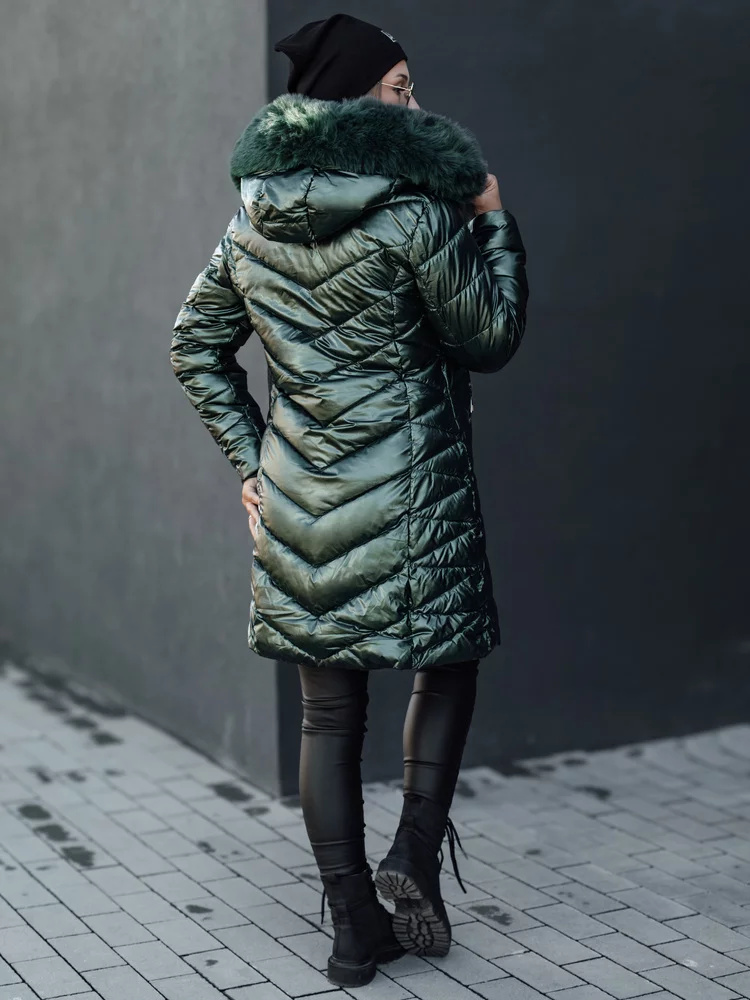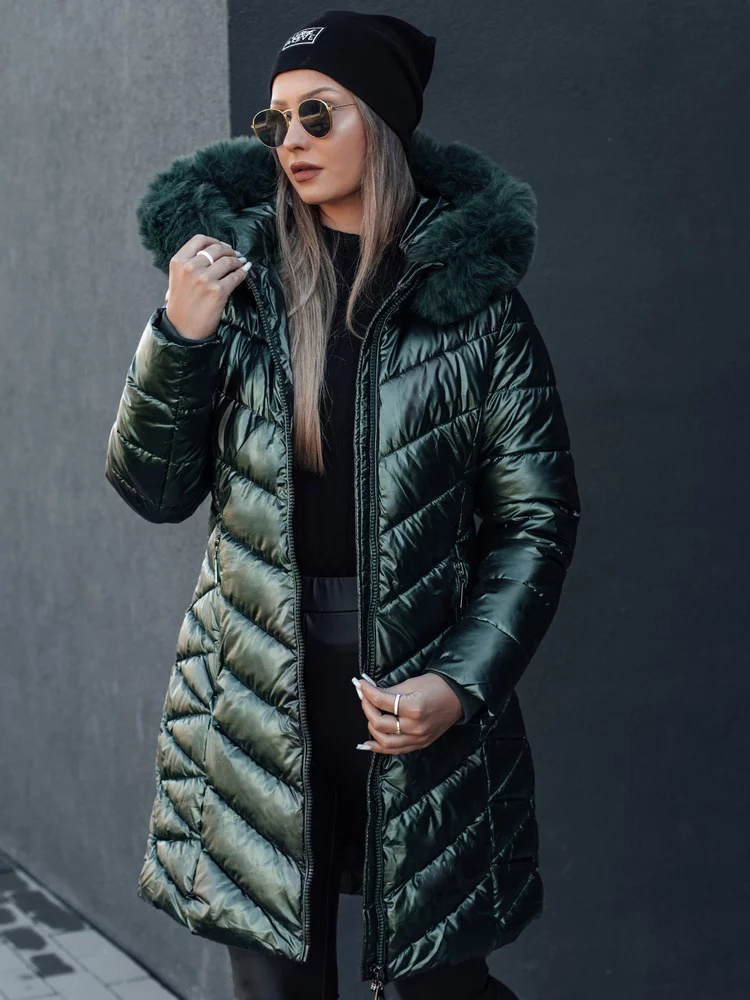 Wyjątkowa pikowana kurtka wykonana z połyskującego materiału. Model posiada nieodpinany kaptur z odpinany futerkiem. Z przodu znajdują się dwie pojemne kieszenie. Całość prezentuje się niezwykle stylowo i modne. Doskonale sprawdzi się zarówno w eleganckich jak i sportowych stylizacjach.